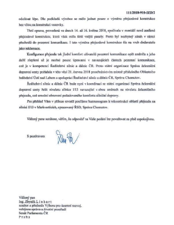 Před nedávnem jsem rozesílal k informaci dopis adresovaný ministrovi dopravy D. Ťokovi ve věci opakovaně nepovedené opravy přejezdu v Markvarticích. Přišla odpověď, kterou posílám v příloze. Představte si, že už zjistili, že železnice kříží silnice a že ty dvě státní organizace spadající pod jednoho ministra se domluvily. Co jsem popisoval v dopise já, to bez uzardění rozepsali znovu. A na závěr, že se to, tedy počtvrté, zase opraví. A k tomu harmonogram … po měsících do roku 2020 … (konec odpisu – doporučuji kouknout!). No uznejte, je to tak náročné, příprava podkladů a zajištění jednání (dva měsíce…!!!) dojednávání, … tři stupně PD !! více než rok, VŘ a pak 4 měsíce realizace … A tito odborníci mají v naší zemi stavět silnice, dálnice a železniční koridory … ?! Jak s nimi řešit cokoliv byť sebejednoduššího ? (upozorníte, jednáte, píšete,… a oni předvedou tuto parodii a ministr se pod to podepíše!):