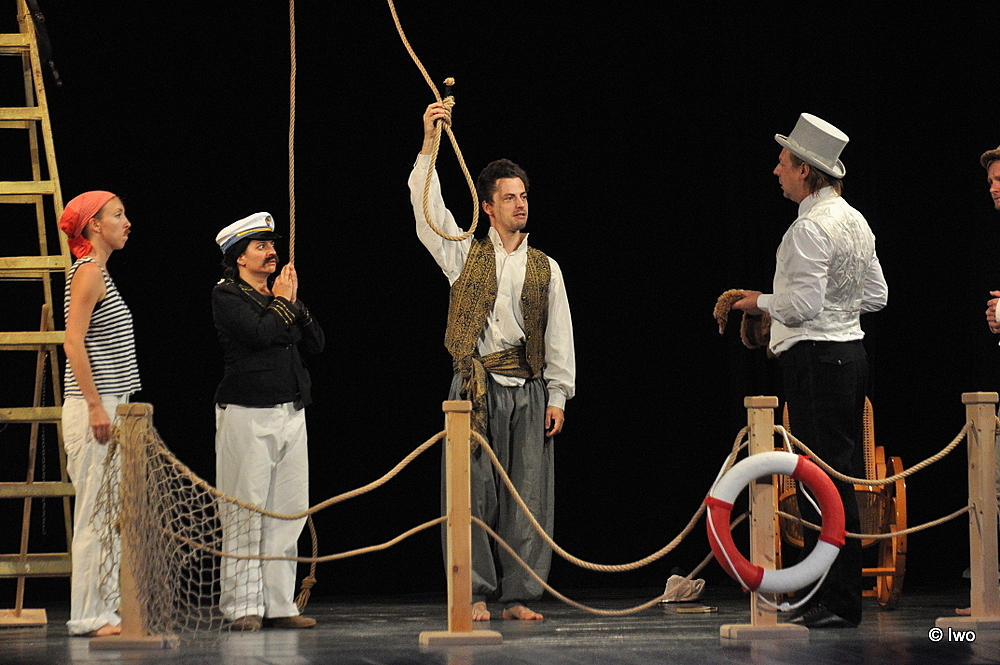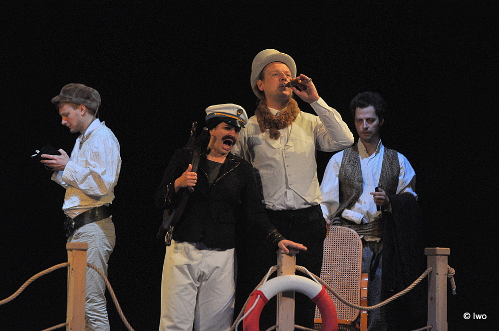 To ovšem neznamená, že jde o nějaké pofidérní představení. I když se prokazatelně s některými neshodnu (část učitelek odcházela velmi nespokojená), po chvilkovém počátečním váhání a naladění na správnou vlnu jsem si tohle hravé a fantaskní bláznění vychutnal. To, co zpočátku vypadalo jako takřka historický dokument, vykazovalo postupně inspiraci komediemi Oldřicha Lipského (jména postav, Santa Mañana) a jasné znaky cimrmanství (placaté globusy mi ukazují směrem k „nehodily se než ku létání“). Fantasticky užitá hudba by stála za samostatný rozbor (při řeči o mořských potvorách zazní strašidelný motiv, doprovázející první objevení žraloka v Čelistech). A několikanásobný konec, v některých partiích jasně předpokladatelný a v některých naopak vůbec, byl už jen třešničkou na dortu.