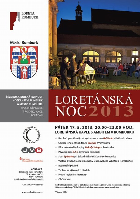 Netradičně večer bude pro děti i dospělé zpřístupněn barokní areál Lorety v Rumburku. V pátek 17. května 2013 od 20.00 do 23.00 h. ožije barokní hudbou, renesančními tanci i filmovými melodiemi. Jediná akce svého druhu na Děčínsku se v Rumburku pořádá posedmé v rámci celorepublikového Festivalu muzejních nocí 2013. Vedle stálých výstav o historii Lorety a kapucínského kláštera bude k vidění objevná česko-německá výstava o křížcích a kapličkách Šluknovska a Horní Lužice. Připravena je řada hudebních vystoupení. V premiéře zazní pohádky inspirované starými německými pověstmi. Netradiční večerní zpřístupnění barokní kulturní památky pořádá Římskokatolická farnost – děkanství Rumburk a Město Rumburk za podpory JVB Rumburk a Sparkasse Oberlausitz – Niederschlesien. Vstupné je 25 Kč.
