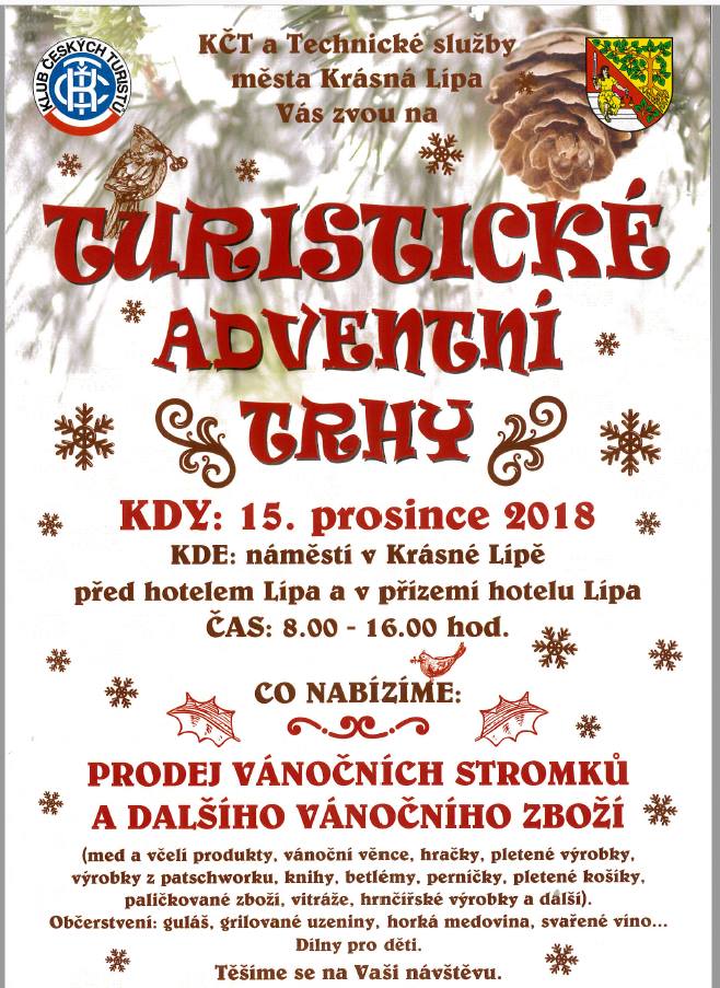 V sobotu 15. prosince 2018 ráno snad bude čas alespoň nahlédnout na turistické adventní trhy v Krásné Lípě. Snad nezklamou své příznivce i poté, co KČT dokázal někdo připravit o nachystané vánoční stromky. Vánoční kapřík ve varnsdorfské bazénu bude opět beze mne. Budu-li schopen, stavím se maximálně večer na basketu.
