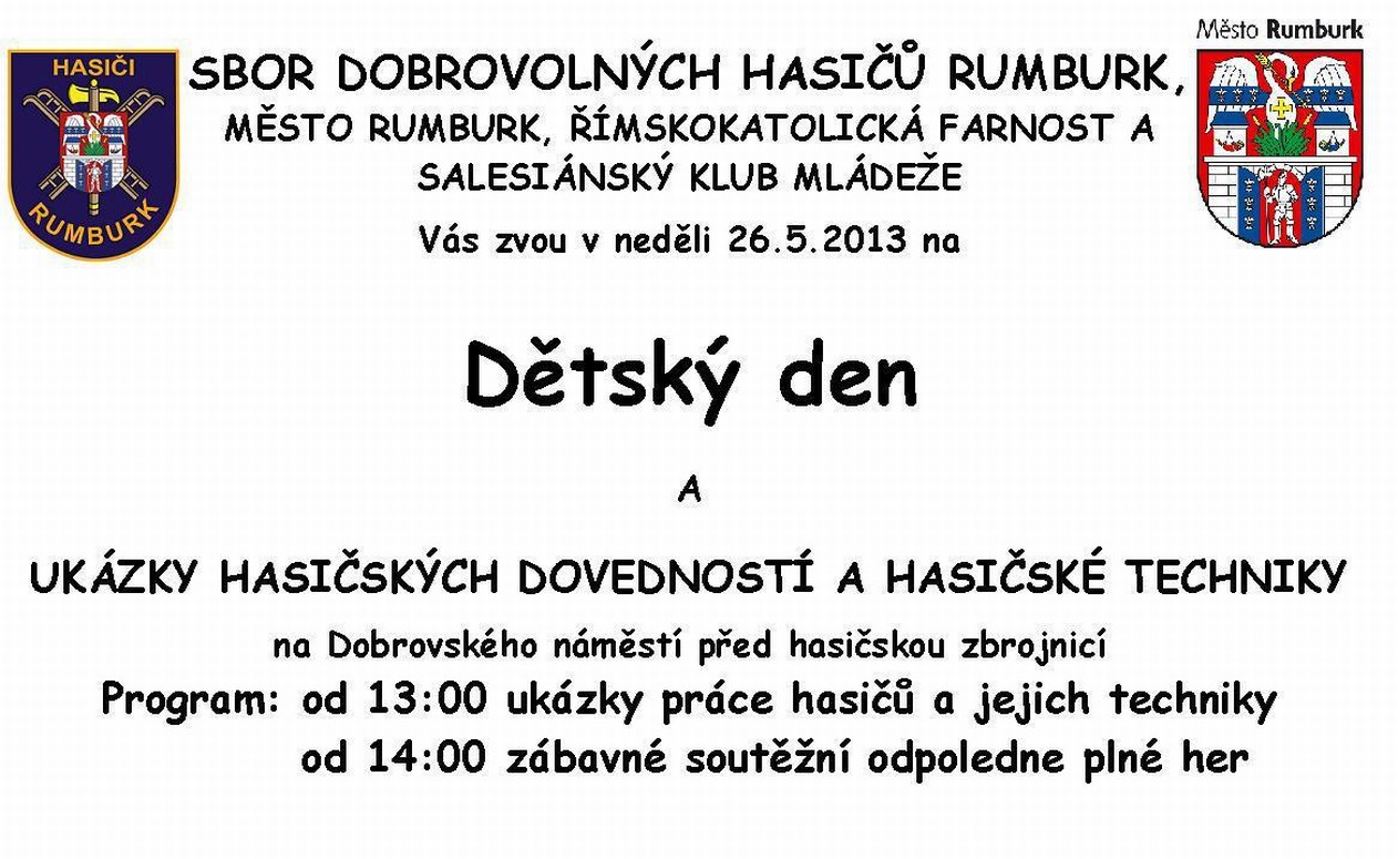 Neděle 26. května 2013 je Mezinárodním Dnem otevřených podstávkových domů, takže v RBK tradičně opět do Šmilovského ulice, a protože se blíží 1. červen, začínají se množit oslavy Dne dětí, takže taky tradičně u hasičárny v RBK nejprve ukázky a pak soutěže. Sportovci ale dají určitě přednost sjezdu z Dymníku, na který jsme zvali na FB.