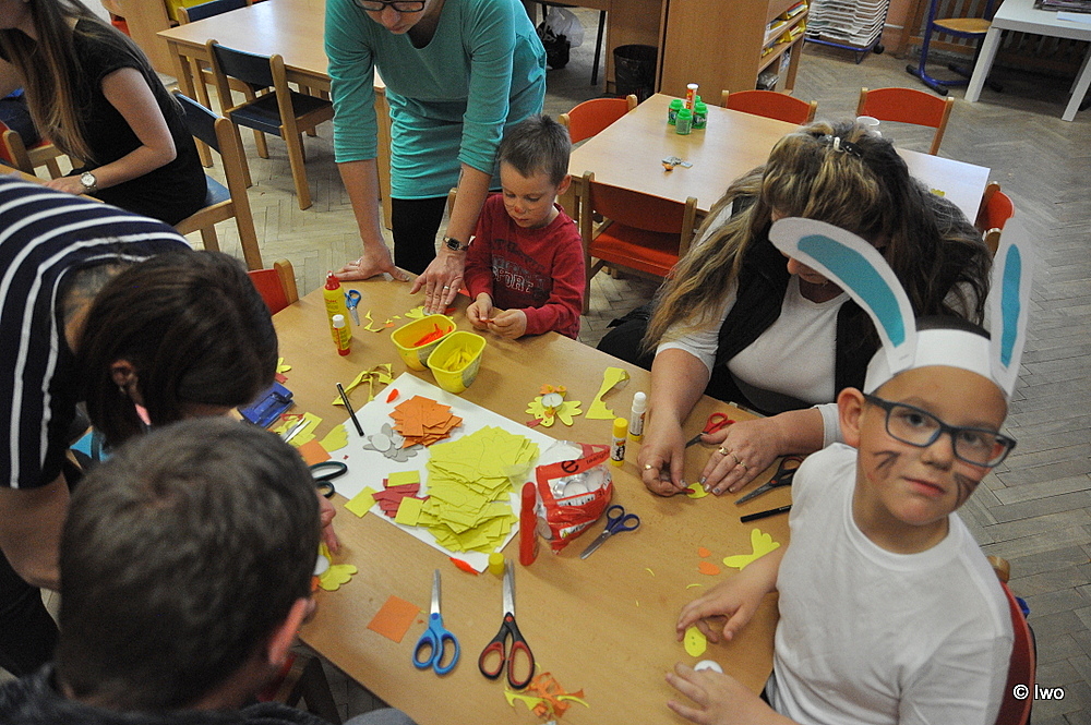 Jako minulý rok – nejprve v tělocvičně pásmo dětských vystoupení a pak už křížem krážem po celé škole. V prvním patře prodej hotových výrobků s velikonoční tematikou. Pocitově proti loňsku přibylo dílniček, něco bylo skoro v každé třídě – od maličkostí po vcelku propracované artefakty.