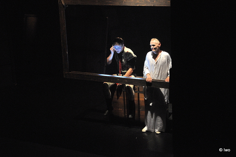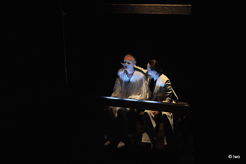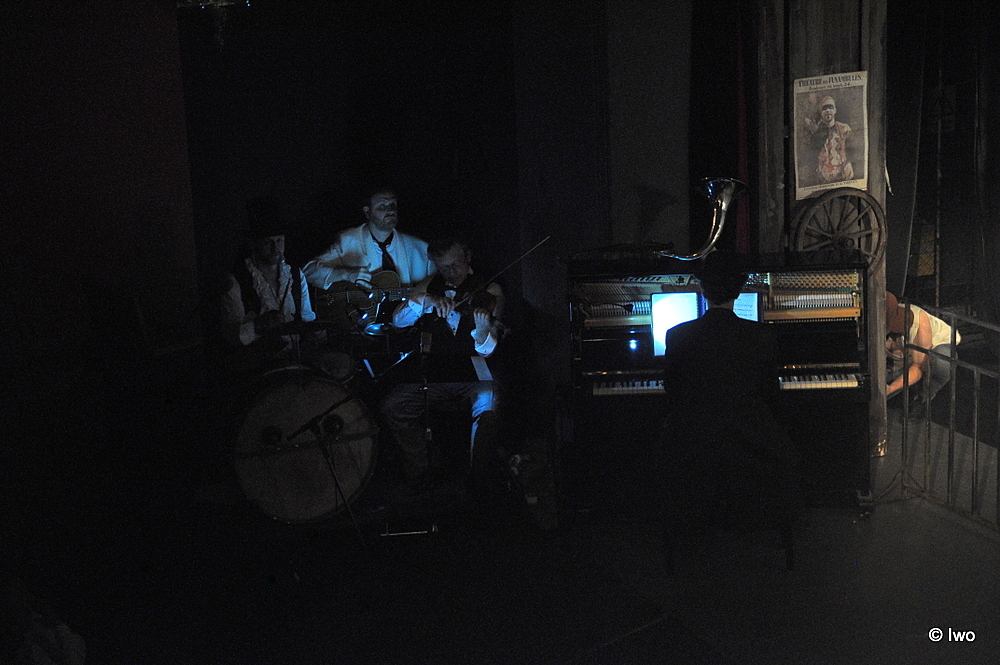 Po pár minutách první půle představení mi naskočil Chaplin. Protože to představení mi přišlo (oprávněně) podobné, leč mělo výhodu – Chaplina známe „osobně“, bylo co studovat a z čeho vycházet. Takže životopisné okamžiky prokládané ukázkami bylo s čím porovnat a odsouhlasit si je. Tady jsem měl zpočátku trochu problém. Dostupné prameny uvádí, že „jeho vystoupení byly dobovými kritikami v novinách hodnoceny jako podmanivé, okouzlující až dech beroucí„, ale jak vlastně vypadaly, těžko soudit. Proto pokusy o rekonstrukci, byť chvílemi jen náznakovou, mi připomněly něco z úplně jiného soudku, česko-francouzský film Klauni. Tam se také mluví o tom, jak trojice komiků byla proslavená a úspěšná, ale ukázky jejich čísel selhávaly, vůbec mi nepřišly komické, natož uchvacující. Tady jsem se prostě taky nějak nechytal a nevěděl, v čem by měl spočívat onen úspěch a okouzlení publika.