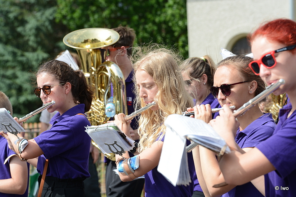 Dorazil jsem s předstihem, na náměstí ještě pusto prázdno, takhle po ránu fungoval jen trdelnický stánek. Na hřišti za kulturním domem generálka na společné hraní na náměstí, a sem tam shlukování souborů. Vyrážím na místo srazu a trochu se vyděsím, protože nikde nikdo. Pro jistotu se vracím, a cestou potkávám první příchozí, takže jsem byl dobře. Průvod se postupně našteluje a vyráží na náměstí jinou trasou, než kterou si pamatuji, a s mnohem většími rozestupy. Navíc mě zaskočí, že kromě kapel a mažoretek se řadí dva folklorní soubory (a hele, Lužičan!) a roztleskávačky.
