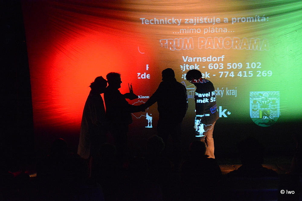 Po besedě a poslechu přesun pod křížovou cestu, kde je připravené plátno a promítačka. Čekal jsem Čadíky, místo nich tu stojí pan Nejtek s panem Štěpánkem (Centrum Panorama Varnsdorf) a na úvod si vyslechneme litanie o nepřipravenosti akce, kdy se za organizátory nikdo pod schody k přípravě promítání nedostavil a za technický personál museli zaskakovat okolo jdoucí dobrovolníci. Naštěstí všechno dobře dopadne, pan režisér pronese úvodní slovo, pan Nejtek dostane ocenění za přínos pro kinematografii a zaplněné schodiště se dočká promítnutí Máje.