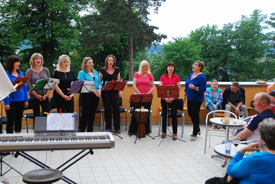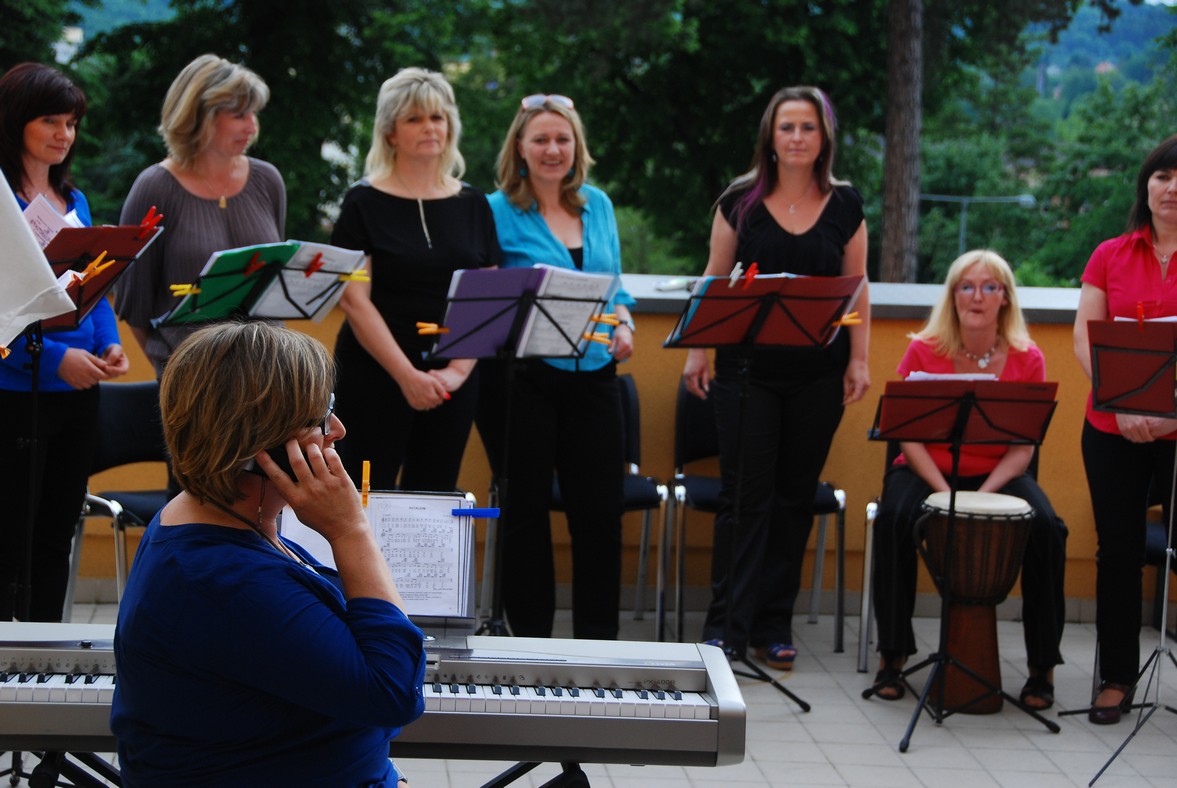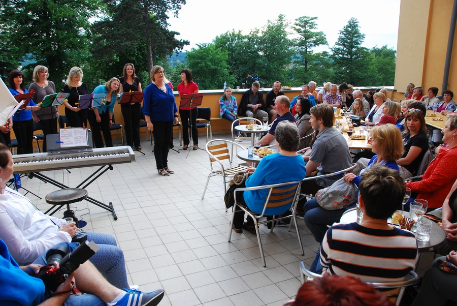 Zatímco v loňském roce se konal jeden koncert, na němž Kvíltet slavil a měl hosty, letos jsme se dočkali dvou sólových vystoupení. Minulý týden Kvíltet s hostující Janou Vébrovou (pan ředitel dával fotku jen na FB), nyní v pátek 14. června 2013 následovalo varnsdorfské Náhodou, pěvecké sdružení pod vedením Aleny Smetanové. Terasa plná tak, až došly skleničky. Nejrůznějších laskomin plné stoly, víno teklo dvěma proudy (červeným a bílým), ale byla i minerálka. A hlavně byly písničky, byť přerušené zvukovou zkouškou chystané hasičské fontány, takže bylo nutno telefonicky zajistit logistiku mezi zpěvem a povely od rybníčku u Billy. Všechno nakonec dopadlo na výbornou. Odešel jsem po druhém přídavku a po poděkování Aleně souborem. Jak jsem si vyslechl později, prý se ta nej zábava rozjela až potom, nakonec údajně zpívali všichni…