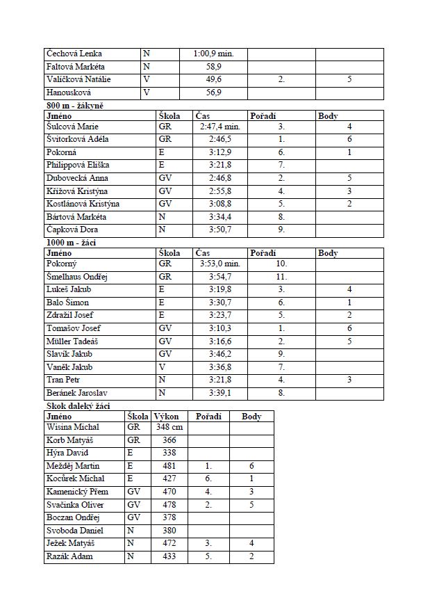 Jako každý rok se zúčastnily 4 kategorie – dívky a chlapci šestých a sedmých ročníků a dívky a chlapci osmých a devátých ročníků (+ vždy odpovídající ročníky gymnázií). Skvělá atmosféra, výborné výkony, v řadě disciplín napětí až do úplného závěru.