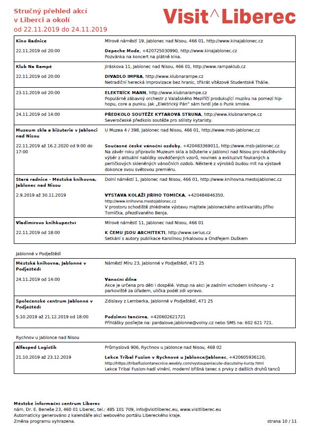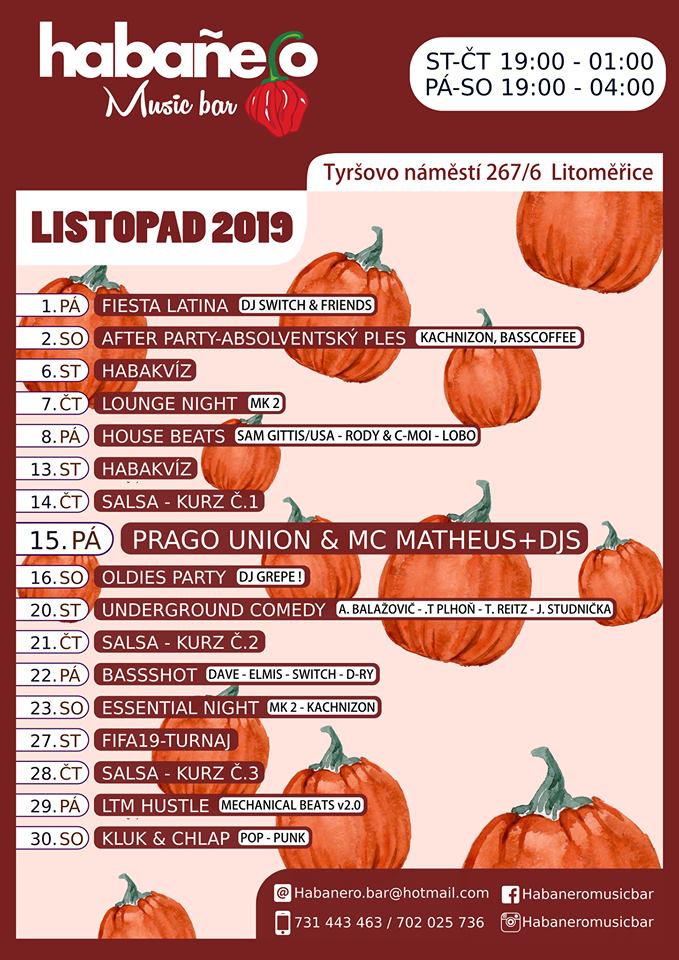 V pátek 22. listopadu 2019 se mi tlučou dvě akce. Termínově se tluče tradiční předvánoční florbalový turnaj pořádaný ZŠ a MŠ Bratislavká Varnsdorf a Den otevřených dveří VOŠ, SPŠ a SOŠS a CR. Rád bych stihl na Bratislavské módní přehlídky, ale není jak vyzvědět časy jejich konání, tak uvidíme. Večer se v tělocvičně ZŠ Edisonova hraje badmintonový turnaj. Hudebních akcí máme v kanceláři plno, výběžanům nejbližší je Ruchadze Band na Fabrice.