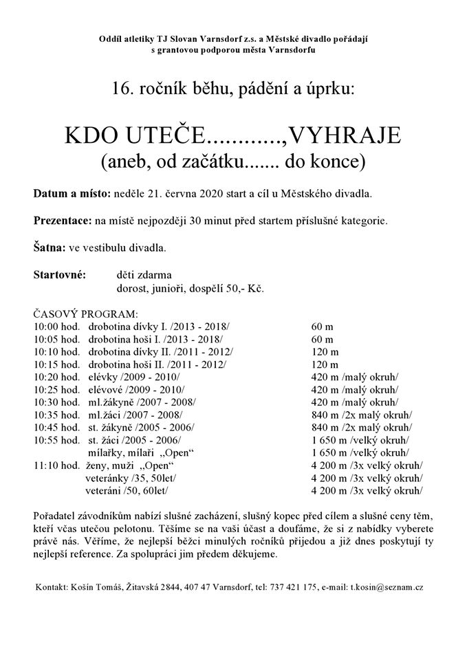V neděli 21. června 2020 se kolem Městského divadla Varnsdorf konal o čtvrt roku odložený 16. ročník běhu, pádění a úprku s názvem Kdo uteče, vyhraje.