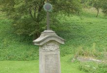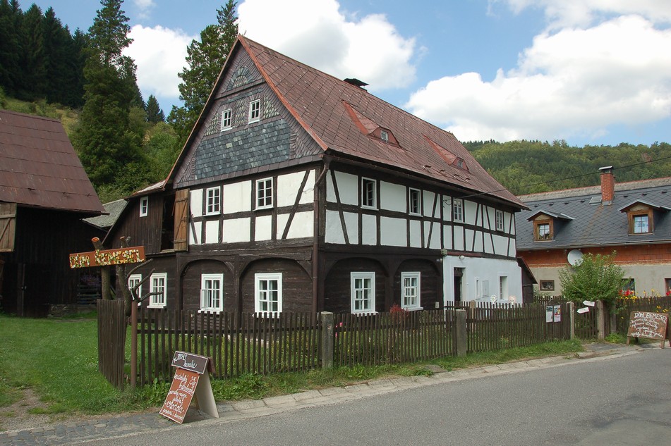 Pokocháni výhledem (i když viditelnost nebyla ideální) zahajujeme sestup, doprovázený výkladem o turistických trasách. Horská hřebenovka, Kuželová cesta, čtyři modré výstupky v červeném poli jako symbol čtyř horských spolků, které se rozhodly vyznačit první horskou (tehdy ještě jednosměrnou!) trasu (pokud jsem dobře slyšel, rozhodnutí padlo ve Varnsdorfu a značilo se žulovými patníky se šipkou). Liberečáci nás zavedou k obrázku, o kterém bychom jinak neměli ani tušení a pak se rozloučí. My sestupujeme dál, až se před námi otevře údolí Novina s úžasným kamenným viaduktem. Tady se opět spojíme v jedno kompaktní těleso (přes les jsme se trochu rozcourali) a pokračujeme do Kryštofova údolí. Takřka přesně dodržujíc časový plán, dorazíme před orlojovým představením a pak máme „rozchod“. Někdo se pokouší uspět s objednávkou v hospodě, v níž je muzeum betlémů, někdo nakoukne do prvorepublikové kavárny, já se jdu podívat do Domu řemesel, patřícímu k prodejně keramiky u orloje. Ono toho tu k vidění zas až tak moc není, lepší je to určitě pro děti, které se mohou vrhnout do zdejší dílničky něco vyrobit. Ovšem venkovní Krmelec ve stodole nemá chybu – jak poznamenává moje spolustolovnice, konečně pořádný bramborák o velikosti gramodesky…