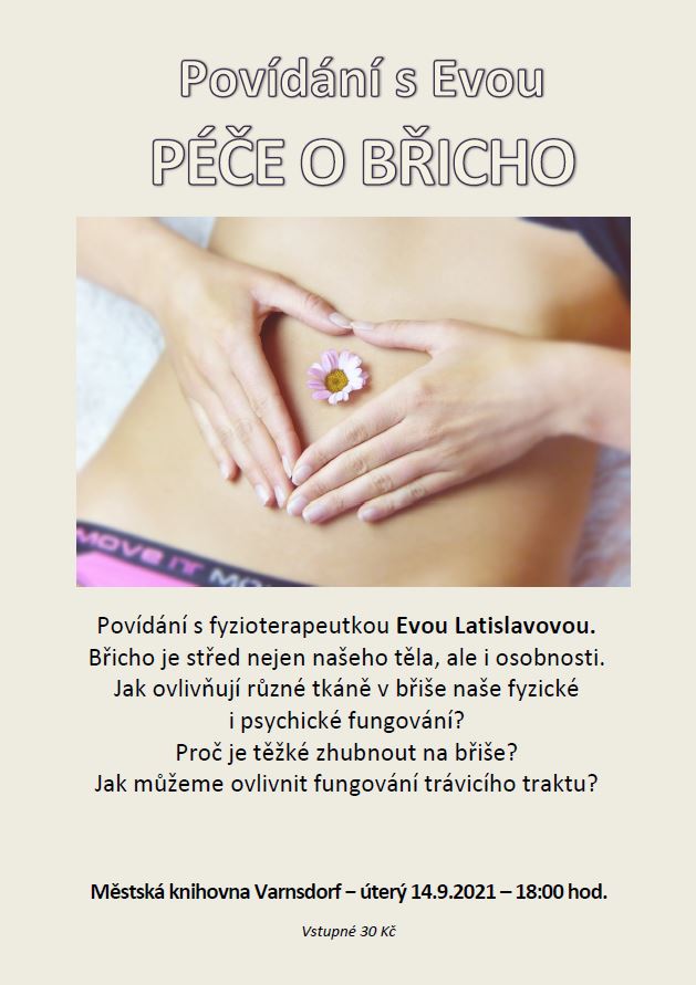 - v úterý 14.09.2021 od 18:00 hod. – Povídání s Evou – péče o břicho – Povídání s fyzioterapeutkou Evou Latislavovou – vstupné 30 Kč