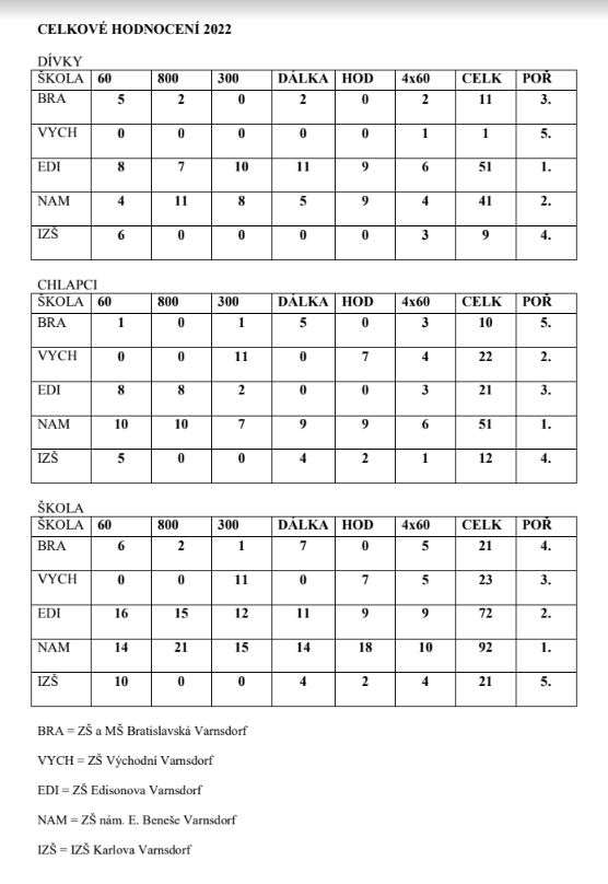 Garantem soutěží je Komise pro tělovýchovu a sport, atletika bude započítána do celkových výsledků Olympiády pro první stupeň ZŠ. Organizátorsky zajišťovala ZŠ náměstí E. Beneše. Na jednotlivých sektorech se vedle rozhodčích z řad AO Slovanu Varnsdorf výborně zapojili žáci devátých ročníků pořádající školy.