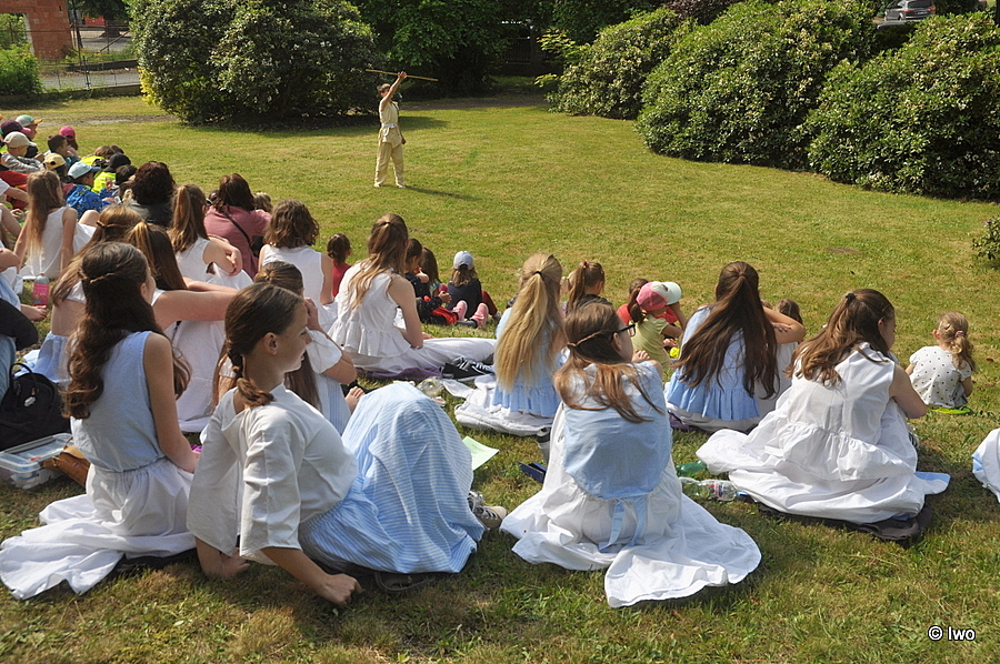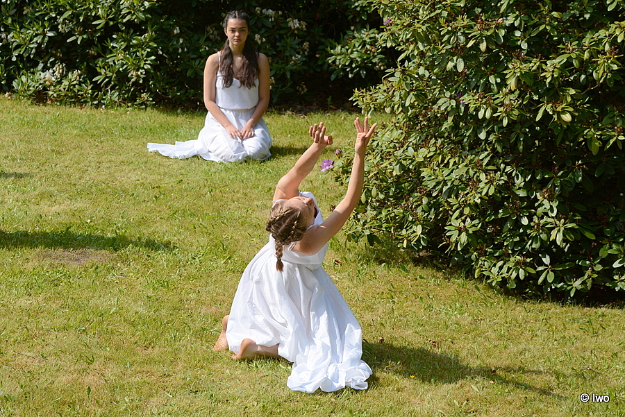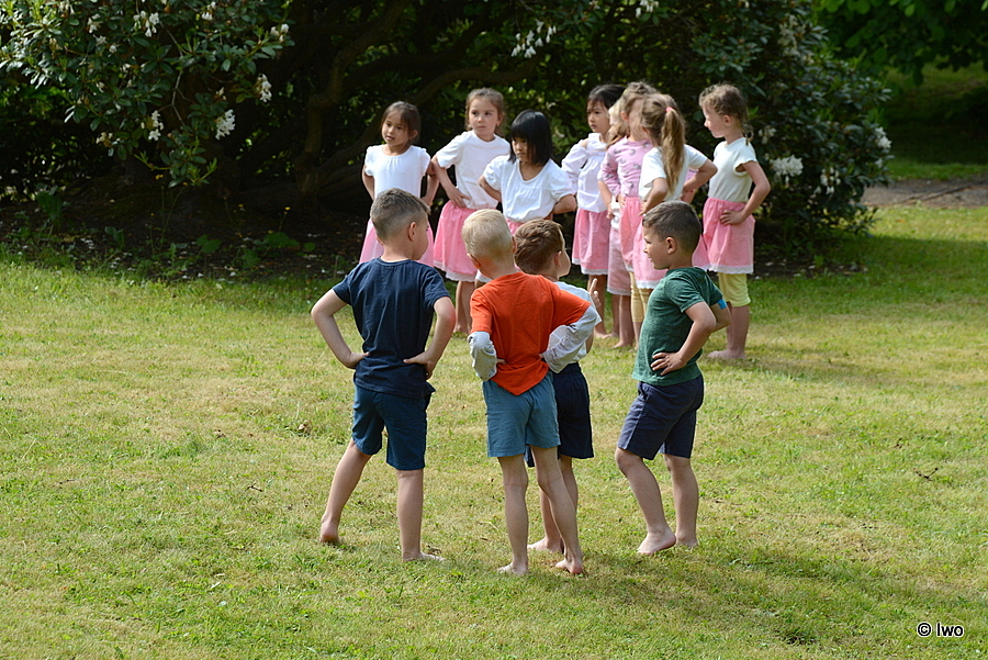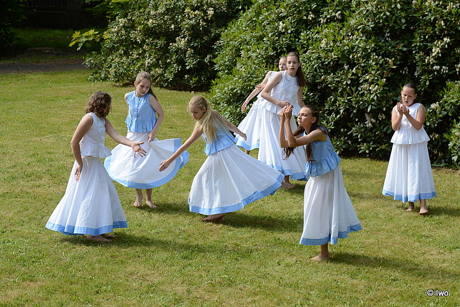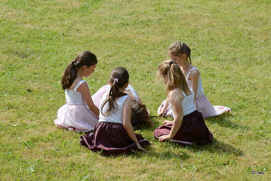 Páteční dopoledne tradičně vytváří prostor pro koláž tanců v zahradě, kde kulisu tvoří vzrostlé keře rododendronů a přirozeným hledištěm je travnatý svah u mateřské školy. I tentokrát do zahrady proudila nekonečná šňůra malých diváčků z varnsdorfských školek, případně jejich rodičů a pedagogického doprovodu. Všichni se usadili, našli si pohodlná místa v trávě a tanec v zahradě mohl být zahájen. Jak již bylo řečeno, tvořila jej koláž tanečních miniatur a překvapivě ji letos propojovala společná inspirace – folklorní odkaz předků vkusnou a citlivou stylizací přetavený do současné tvorby, podpořená výběrem kvalitního hudebního doprovodu.