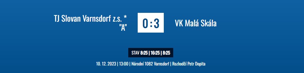 V neděli 10. 12. 2023 se odehrálo poslední podzimní kolo KP2 žen. Varnsdorfský tým skládající se z kadetek a juniorek TJ Slovanu na domácí půdě přivítal ženy z VK Malé Skály, které vedou tabulku soutěže. Že to bude těžké utkání bylo jasné od začátku. Varnsdorfská děvčata hrající tuto soutěž jako soutěž doplňkovou a na ohrání se nechtěla dát zadarmo. Tvrdý servis soupeřek byl občas pořádnou školou do budoucna, avšak děvčata makala a chvílemi již byl vidět pohledný volejbal. I když soupeřky vyhrály 2x 3:0, pro mladý tým Slovanu to bylo vítězství nabývání zkušeností.