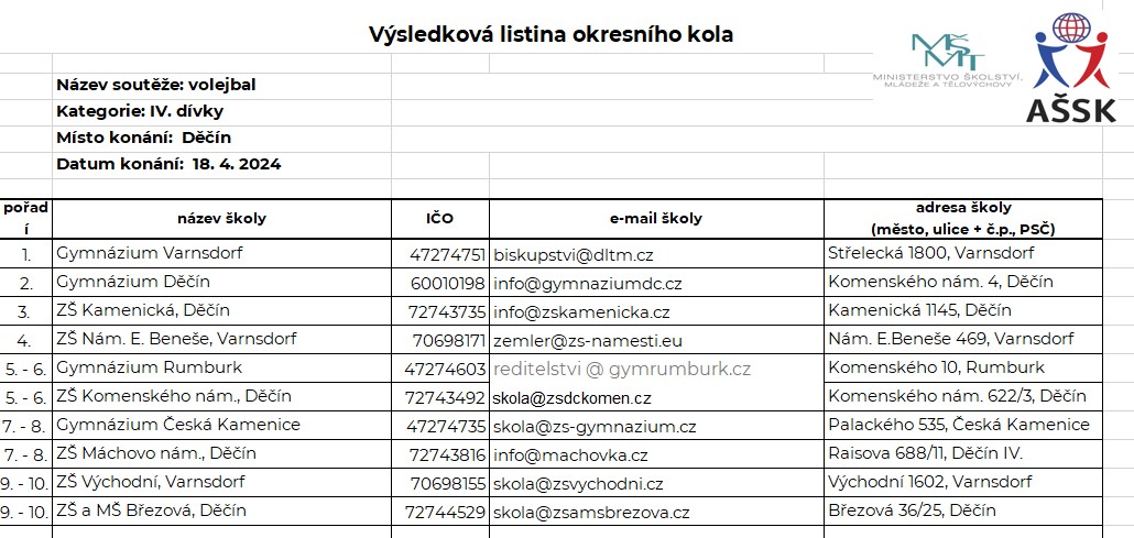 Do finálových zápasů se tedy dostaly týmy: ZŠ VDF E. Beneše, Gymnázium Varnsdorf, Gymnázium Děčín a ZŠ Kamenická. První zápas GVDF – ZŠ Kamenická, výhra pro GVDF. Druhý zápas naše holky proti G Děčín. Přes pěkný začátek bohužel naše holky podlehly a čekal je zápas o třetí místo se ZŠ Kamenická, se kterými jsme již hráli. Výsledek byl lepší, ale opět naše holky podlehly. Nevadí! Odvážíme si krásné 4. místo a za rok se ukážeme určitě zase a věřím, že budeme zkušenější a předvedeme výsledek, který nám zaručí medailové umístění. Dívčí kategorii vyhrály holky z Gymnázia Varnsdorf. Určitě je potřeba zmínit, že složení našeho týmu je převážně z mladších žákyní, což ještě více umocňuji náš úspěch v podobě čtvrtého místa.