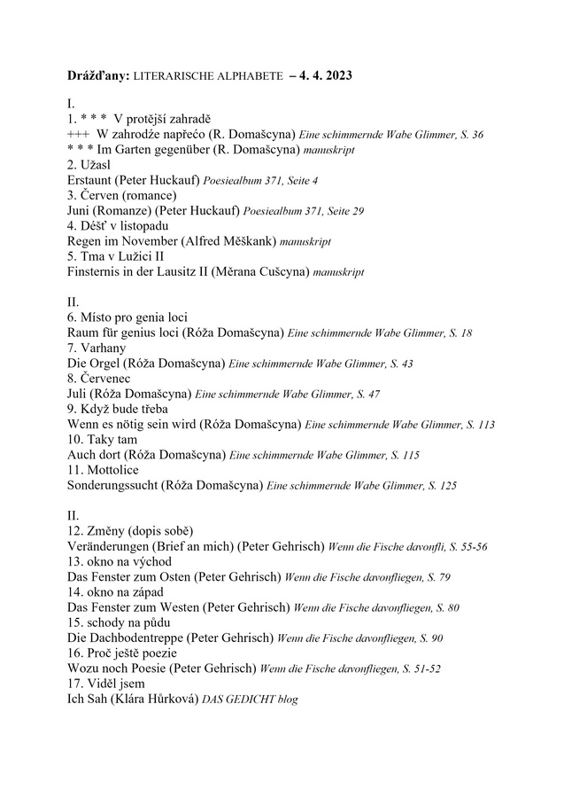 Program Literarische Alfabete je spolufinancován z daňových prostředků na základě rozpočtu schváleného Saským zemským sněmem. Podpořeno městem Drážďany, Úřadem pro kulturu a památkovou péči města Drážďany a Pro Helvetia, Švýcarskou uměleckou radou.