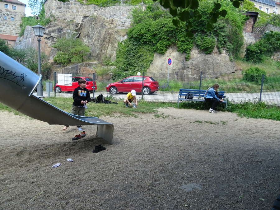 Obědovou pauzu v parku vedle Staré vodárny (Alte Wasserkunst) s vyhlídkou na Domek čarodějnice (Hexenhäusel) a most Míru jsme si zpestřili pobytem na dětském hřišti. „Takové u nás tedy nemáme!“ „Tady je to všechno tak pěkné, to u nás není!“