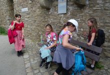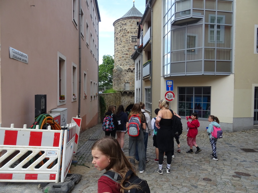 Po skončení prohlídky muzea jsme se vydali podél hradeb Ortenburgu, kde jsme si dávali dobrý pozor na „prevíty“ (vyústění odpadů z prevétů – záchodů), směrem k Mikławšku (Nicolaifriedhof). Mikławšk je takový budyšínský „Slavín“, kde je pochována řada významných lužickosrbských osobností. „Tady to vypadá jako na Oybině!“ hlásily děti. Sedli jsme si do trávy, rozebrali desky, čtvrtky a tužky a pustili se do kreslení v plenéru. Někteří vytáhli fotoaparáty a šli fotit zbytky kleneb nebo malebné výhledy. Někdo kreslil okolní architekturu, někdo zajímavé náhrobky a někdo kamaráda, jak kreslí.