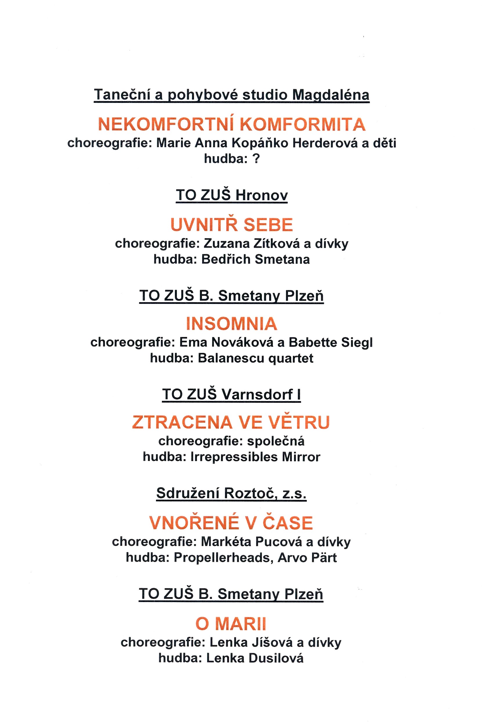 UVNITŘ SEBE – vytvořila Zuzana Zítková a dívky na hudbu Bedřicha Smetany, tančilo 9 tanečnic ze ZUŠ Hronov. Je to tak těžké najít tu odvahu a nahlédnout sebe sama kdo jsem uvnitř. Díky pochopení hudební partitury došlo k hlubokému naplnění pohybu těl tanečnic jejich výpovědí. Vše skrze hudbu, bez patosu, s lehkostí a nadhledem, v hbitosti a proměnlivosti skupiny v prostoru.