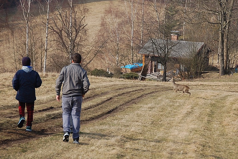 Přes louky a lesy do údolí Vlčího potoka s občasnými zastávkami s výkladem, vzduch se postupně ochlazuje a když vidím na cestě první zamrzlé louže, říkám si, že by to nemuselo být až tolik zlé. KČT má situaci zmapovanou, střídali se tu „na hlídkách“ v hustých intervalech, takže dobře vědí, kde je ještě něco málo k vidění. Sice je pravda, že čas a teploty nemilosrdně postupují, přesto ještě stále je nač koukat (ani před pár dny to ale nebyla žádná velká sláva). Jednou z odboček z hlavní cesty se dostáváme k zelené turistické značce, přicházející od Šternberka, přes louku s výhledem na rozhlednu na Vlčí Hoře míříme k silnici.