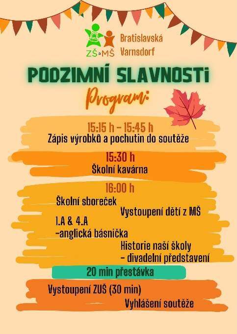 Ve středu 25. září 2024 jsme měli v městském divadle Podzimní slavnosti. Nejdříve vystoupili naši nejmenší – děti ze školky. Poté zazpívaly pár hezkých písniček děti ze školního sborečku. Následovala anglická básnička žáků z první a čtvrté třídy. Nakonec našeho vystoupení bylo divadelní představení, které se jmenovalo Příběh naší školy. Po kratičké přestávce zahrál krásné melodie Jazz Band René Habicha a rodiče mohli ochutnat kávu a malé občerstvení v Kavárně u Bráti. Nakonec vyhlásila paní ředitelka Iva Špičková vítěze soutěže o nejchutnější podzimní pochoutku a o nejoriginálnější podzimní výtvor.