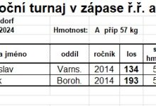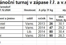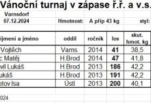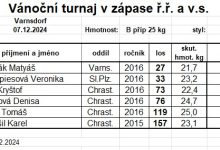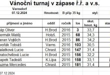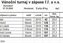 V sobotu 7. 12. 2024 jsme ve varnsdorfské sportovní hale přivítali 89 zápasníků a zápasnic z celkem 11 oddílů České republiky. Konkurence byla veliká ale našich 16 zástupců podalo parádní výkony, které přispěli k celkovému 3. místu mezi oddíly. I letošní ročník zahájila legenda varnsdorfského zápasu pan Jan Durec. Na dvou žíněnkách jsme mohli vidět neuvěřitelné boje v duchu fair play. Všem našim zápasníkům a těm, kteří nám s turnajem pomohli, patří velké díky. Jmenovitě městu Varnsdorf, které náš turnaj podpořilo svým dotačním programem a sponzorům: pivovar Kocour, Samat, for wood, stavebniny Gabriel, cukrárna Bea, cukrárna Dlask, Jiří Pachman, František Hrabčák, Lubomír Katuščák).