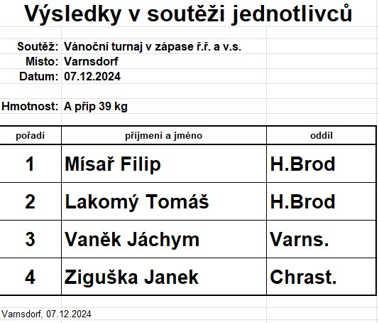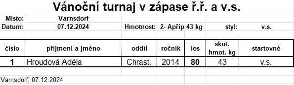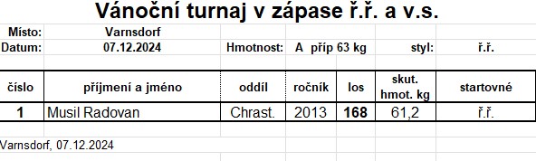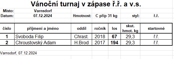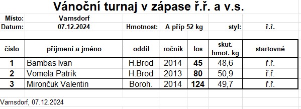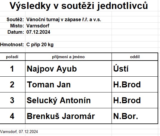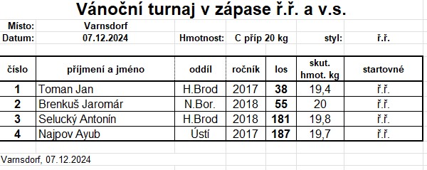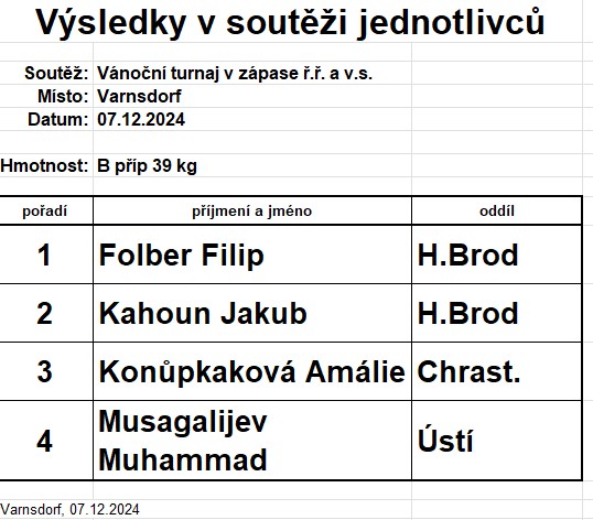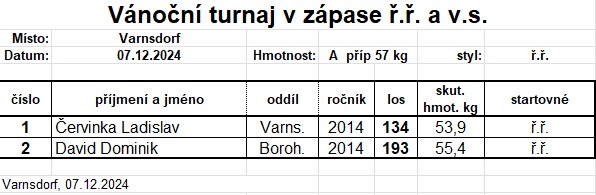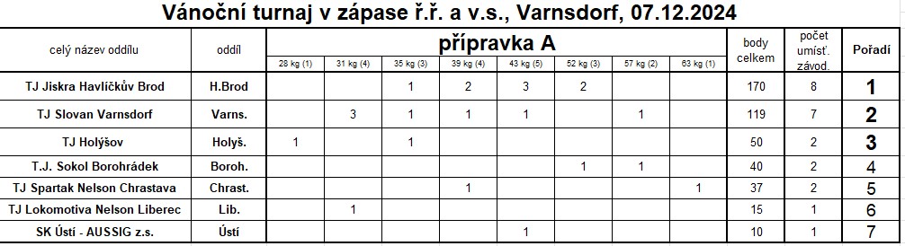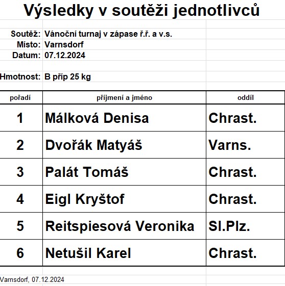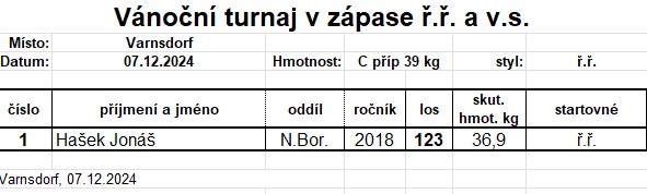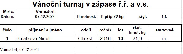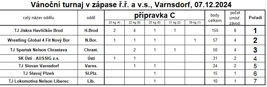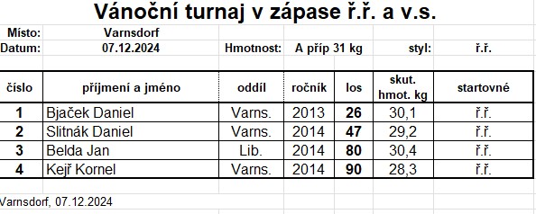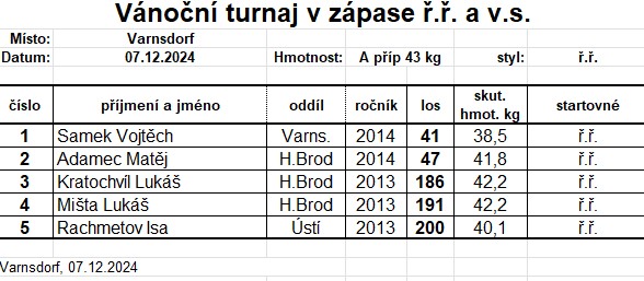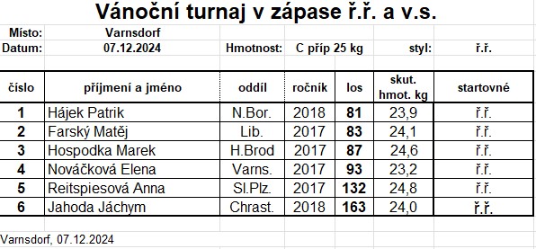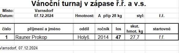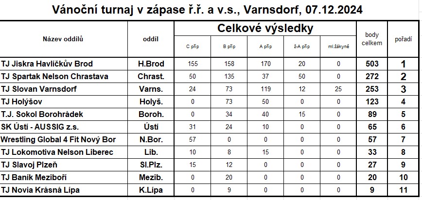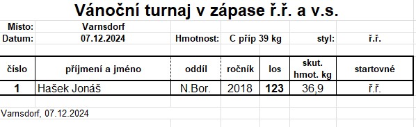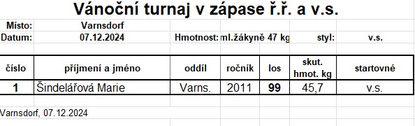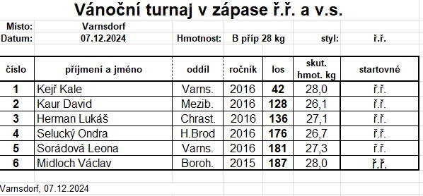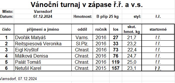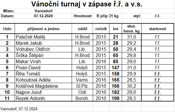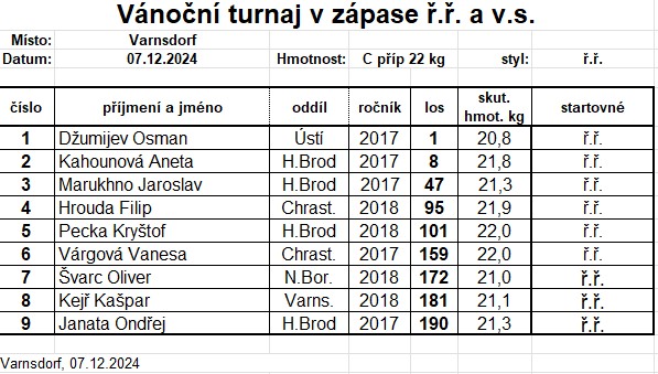V sobotu 7.12.2024 jsme vyrazili na turnaj do Varnsdorfu, kde se sjelo celkem 12 týmů a 89 zápasníků.