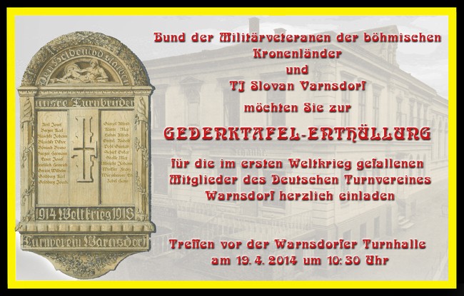 Dovolujeme si pozvat Vás a Vaše přátele jménem Svazu c. k. vojenských vysloužilců zemí Koruny české a dalších organizátorů sobotní akce (města Varnsdorf, TJ Slovan Varnsdorf, Manfreda Rohdeho aj.) na slavnostní odhalení řezbované pamětní desky padlým sportovcům, které se uskuteční v tělocvičně pod varnsdorfským Náměstím Ed. Beneše dne 19. dubna 2014 v 10.30 hod. Přijďte důstojně oslavit Bílou sobotu pietním aktem a svou účastí podpořit kulturní život výběžku. Za Vaši účast předem děkujeme