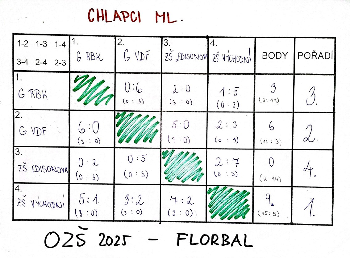 I chlapci bojovali ze všech sil. Mladší žáci se umístili na třetím místě. Starším chybělo trošku sportovního štěstí. Sice porazili velmi silný tým ze ZŠ Náměstí E. Beneše, pak ale smolně prohráli se ZŠ Edisonova a ZŠ Dolní Podluží. Během těchto zápasů měli silnou převahu, ale nepodařilo se jim dát potřebný počet gólů. Nakonec obsadili páté místo.