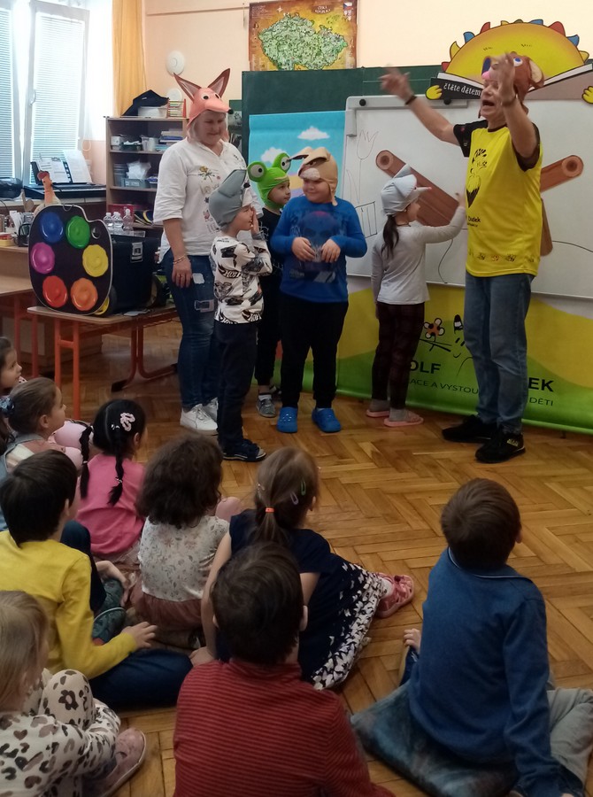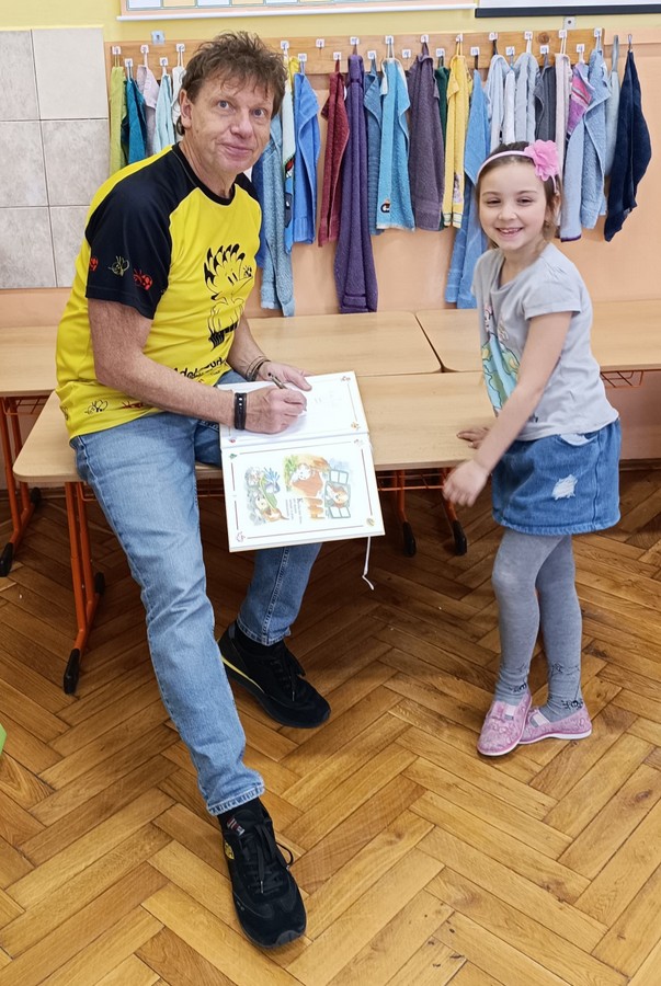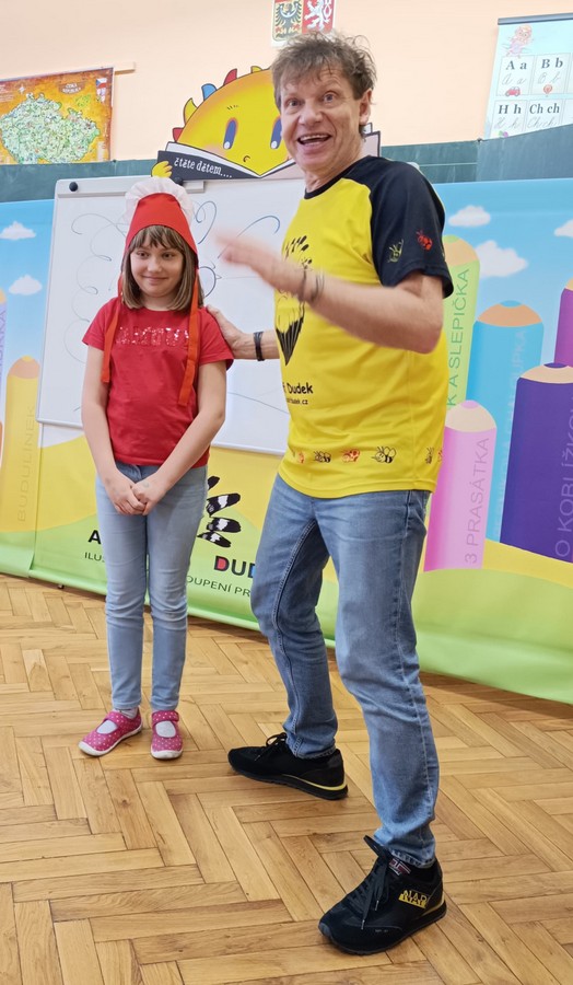Přijel totiž za nimi náš nejznámější současný ilustrátor dlouhé řady dětských knih pan Adolf Dudek. S dětmi se seznámil při autogramiádě, podepisoval jim jejich knížky se svými ilustracemi. To ale ještě děti netušily, co je doopravdy čeká. Pan Dudek s obrovskou energií rozjel show, do které bez váhání kromě dětí zapojil i všechny přítomné pedagogy. „Přehrál“ dětem tři pohádky (O Červené karkulce, O budce, O Budulínkovi), ovšem v jeho provedení rozhodně známou klasikou nebyly! Pan Dudek kreslil na keramickou tabuli postavy i předměty z pohádek, děti hádaly a doplňovaly, staly se přímými účastníky děje. Byla to neskutečná zábava, nadšené děti se hodinou doslova „prosmály“ a za žádnou cenu nechtěly konec.