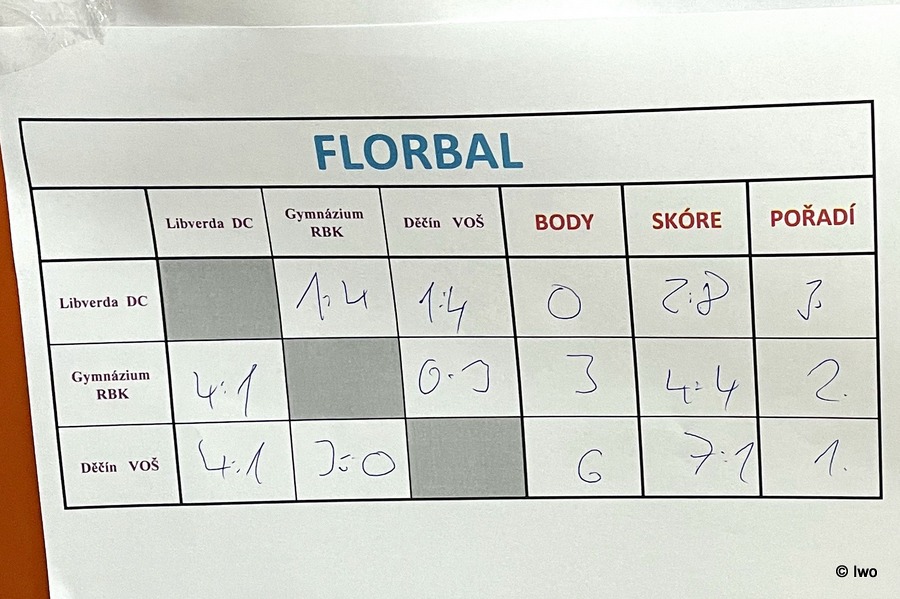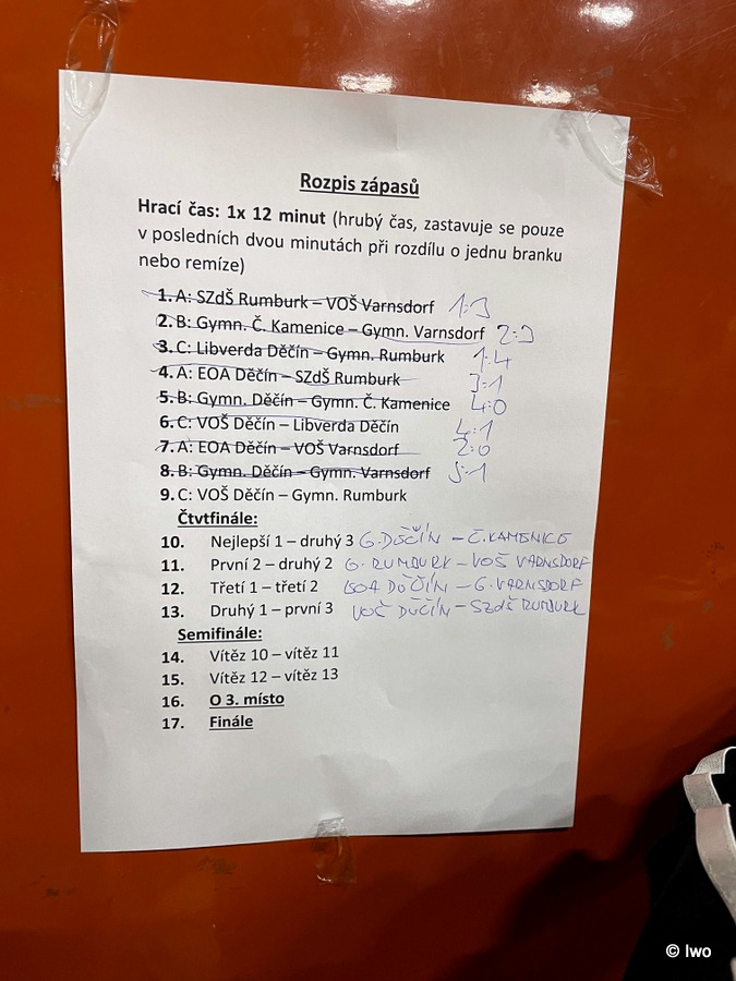 To ostatní vlastně stejné – holky svoje odehrály v Děčíně, jak informuje rumburský gympl. Kluci u nás ve VDF, prý pořád kvůli tomu, že v Děčíně není hala odpovídajících parametrů. Proč holkám DC vyhovuje a klukům ne, kdo ví. I tak nutné zjednodušení – hrací čas jen 12 minut a v poli 4+1 místo (místo prý obvyklých 5+1). Přihlášeno 9 týmů, takže tři skupiny po třech. Vydržel jsem jen základní kolo.