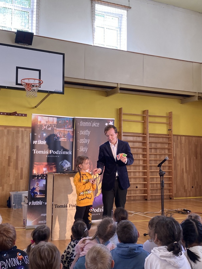 Kouzelnická show ale nebyla jen o tricích – Tomáš Podzimek dokázal skvěle pracovat s publikem, vtáhl do programu několik odvážlivců z řad žáků a pobavil i ty největší skeptiky. Zkrátka – kouzla fungovala, smích zněl sokolovnou a kouzelník dostal zasloužený potlesk. A i když žádné domácí úkoly nezmizely (škoda!), nálada po vystoupení byla jasně kouzelná.