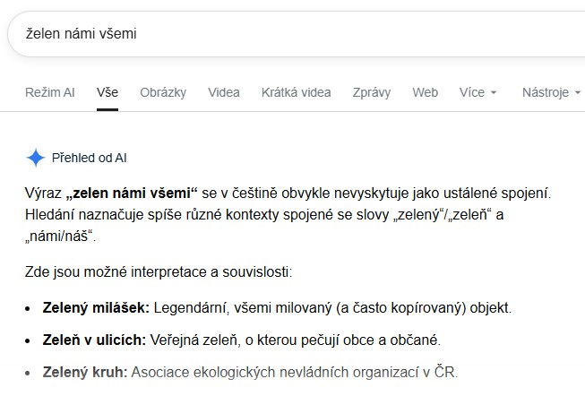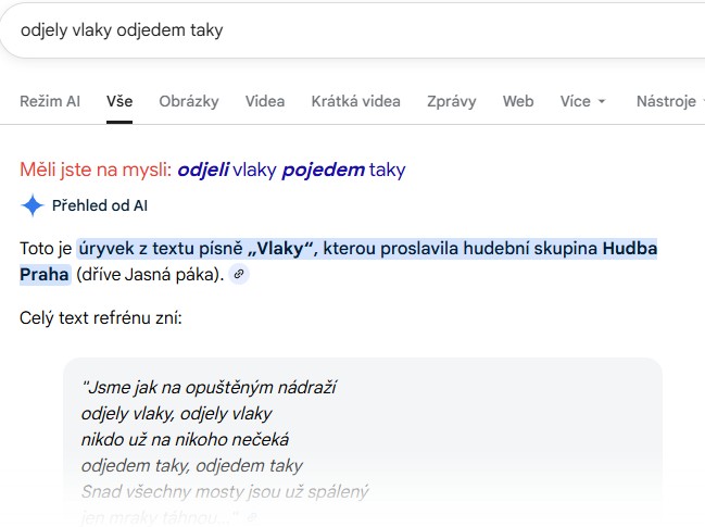 Narážím na to čím dál častěji – Google totiž primárně nenabízí relevantní odkazy, ale takřka přes celou obrazovku výplod jeho metainteligence. A já mám jednoznačný pocit, že jejím primárním úkolem je hlavně odpovědět. Cokoli. Bez ohledu na faktickou správnost, na relevanci.