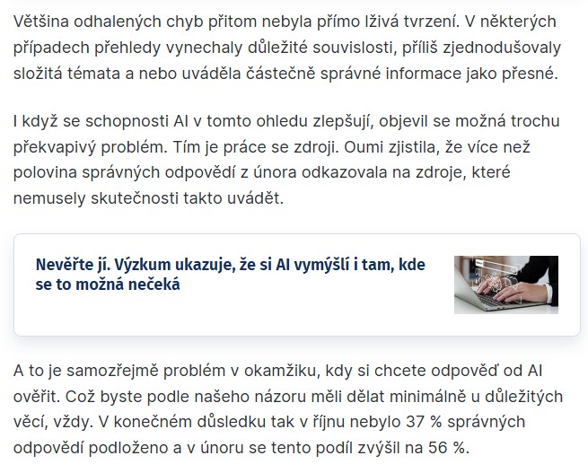 Aby odpověděla, smíchala hrušky a jablka – roky 2023, 2024, 2025 dohromady. Jednotlivosti jsou pravda. Jenže každá z jiného roku. Fakt mě mají takové výsledky přesvědčit o tom, jak je AI úžasná, neomylná, potřebná a pravdivá? Je to program, který MUSÍ dát odpověď, i když si ji občas prostě vymyslí.
