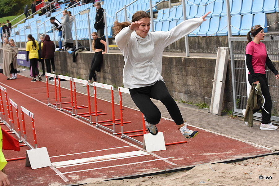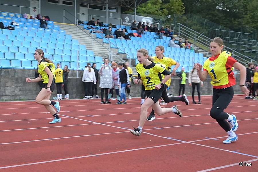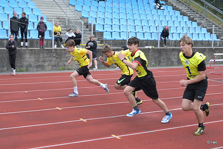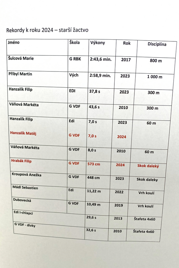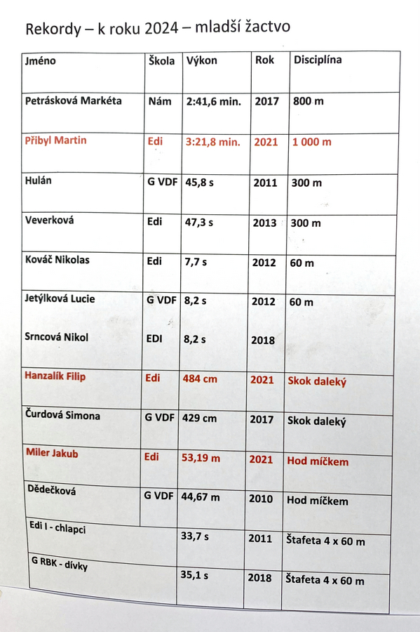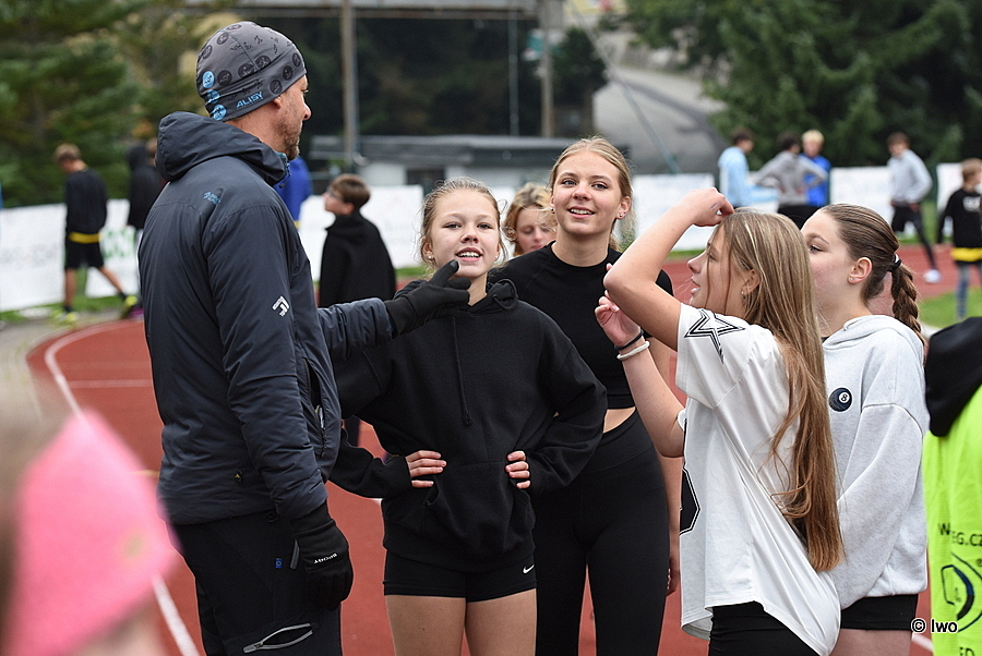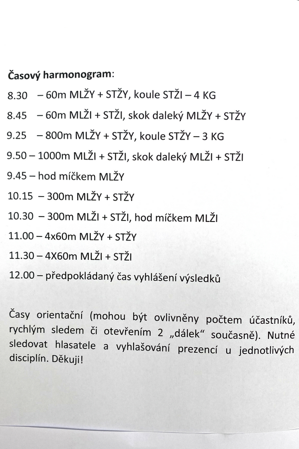Celkem osm týmů – čtyři školy v kategoriích mladší a starší žactvo, dívky x chlapci. Disciplíny probíhaly průběžně. Lákala nejen „šedesátka“, ale kupodivu i delší běhy – 300, 800 a 1000 metrů. Zajímavé byly souboje ve skoku dalekém. Starší žactvo se popasovalo s vrhem koulí, mladší se snažilo „urvat“ co nejlepší výsledek v hodu míčkem. Každý si přišel na své. Ovšem zlatým hřebem