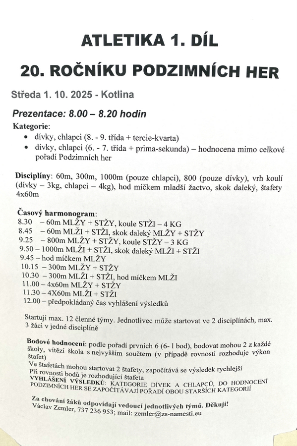 Tradiční Podzimní hry byly zahájeny ve středu 1. října 2025. Jako první v jubilejním 20. ročníku dostala slovo atletika.