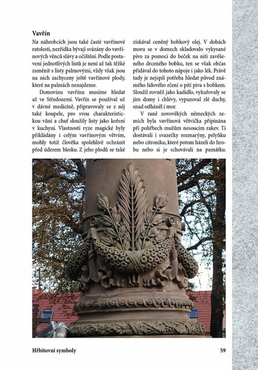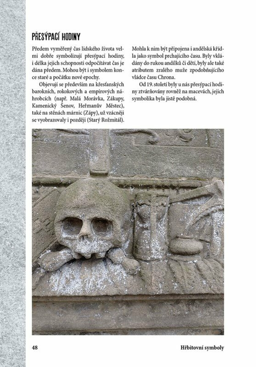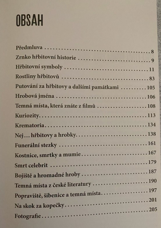 Tahle kniha tomu všemu dává teoretický základ, pevný rámec. Nečekejte od ní jednoduchou kuchařku „jeď tam a tam, najdi to a to, prohlédni si“. Je rozkročena mnohem šířeji – od nástinu dějin pohřebnictví přes symboliku (zhusta dokumentovanou detaily hrobů z Kamenického Šenova!) po pár špeků (kostnice, krematoria, filmová místa, bojiště) – ostatně, z obsahu je to vidět.