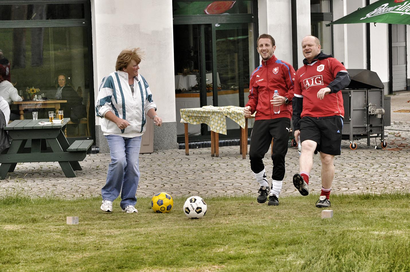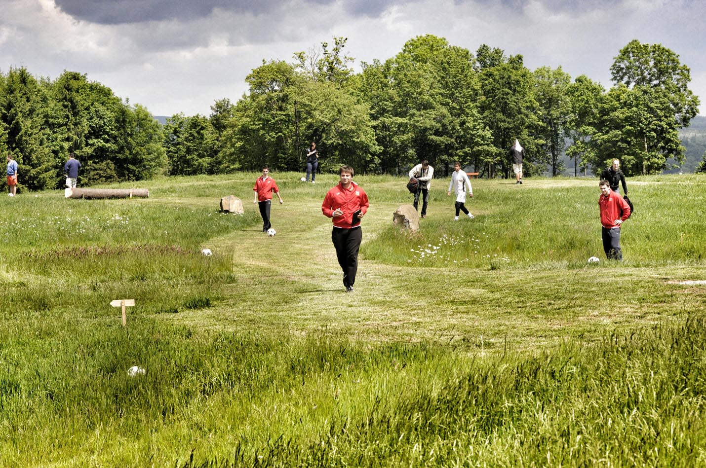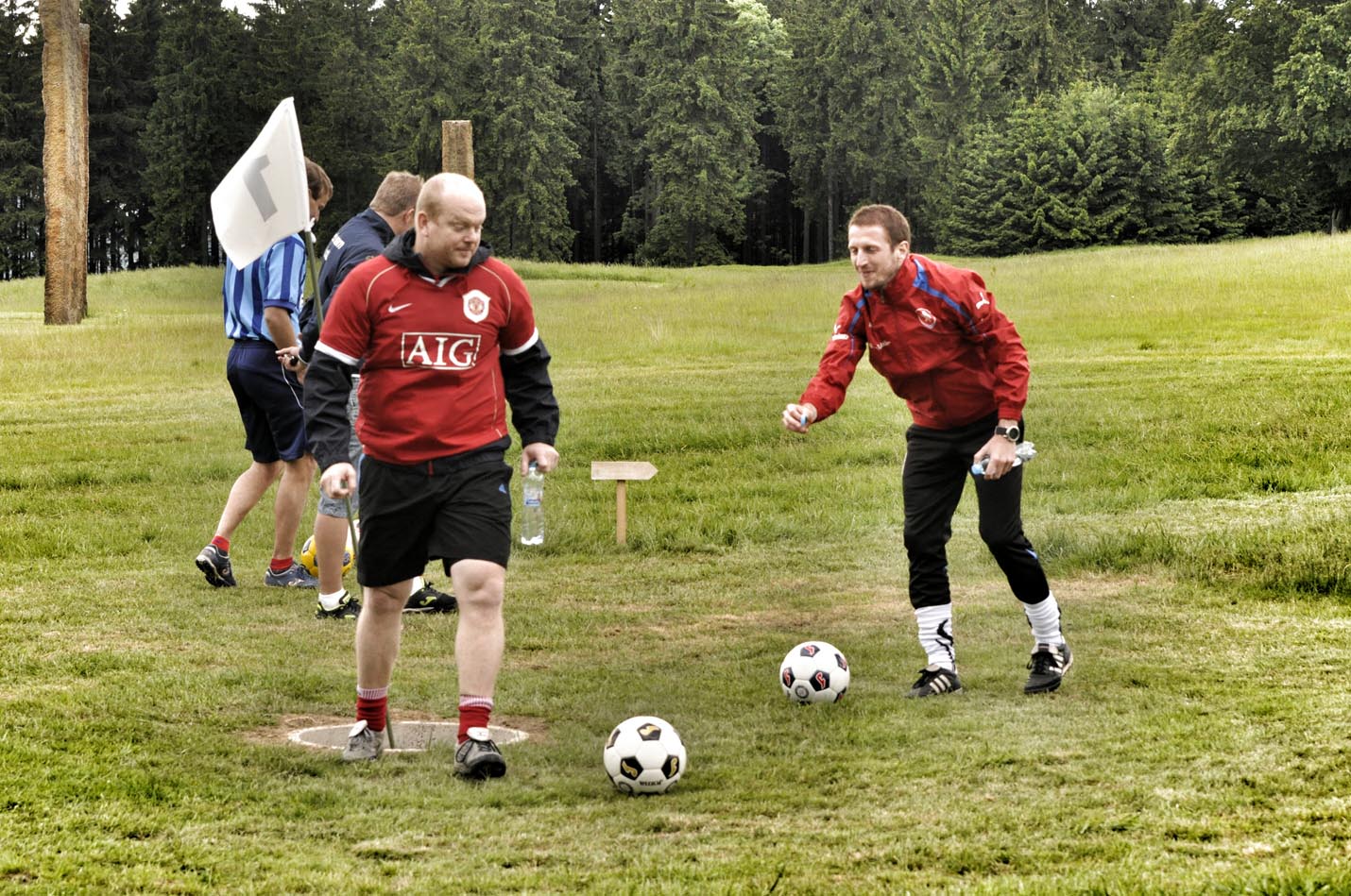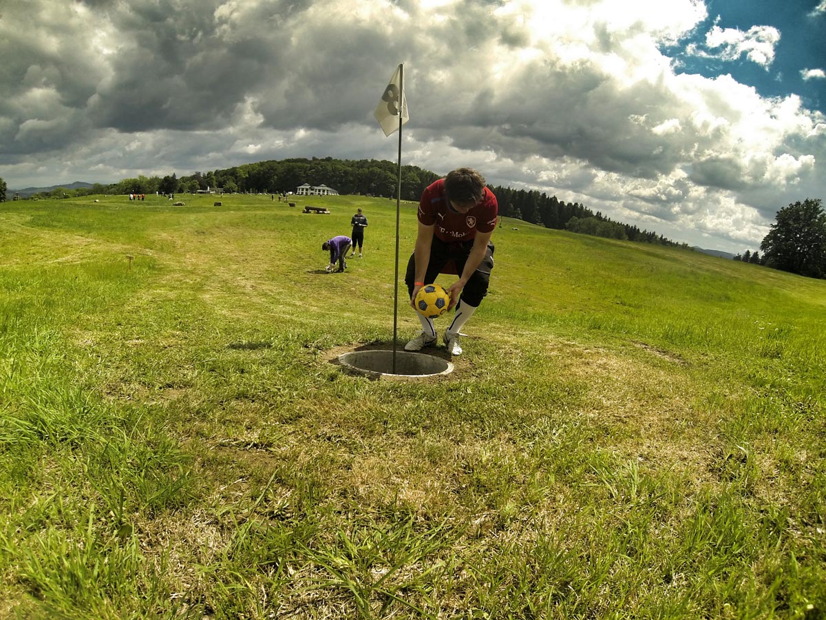 Po hře jsem několikrát slyšel, že ke hře je potřeba golfové myšlení a dobrá kopací technika, ano místo celého pytle holí máte jenom dvě nohy. Proti golfovému hřišti je fotbal — golfové upravené přeci jenom více „nahrubo“. Tuším, že osmá jamka končí ve svahu a green si ještě patřičně nesedl. Slyšel jsem tu od hráčů spoustu slov, kteá obvykle používám jenom když mi něco opravdu nejde a v blízkosti nejsou děti.