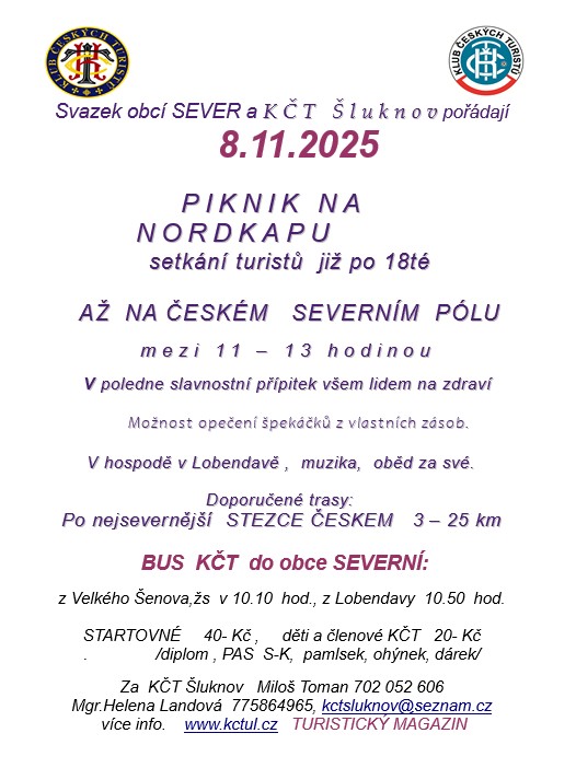Zdravíme odvážné turisty. Zveme MALÉ i VELKÉ k setkání na NORDKAPU, na nejsevernější STEZCE ČESKEM 8. 11. 2025 - a to již po 18té. Helena Landová KLUB ČESKÝCH TURISTŮ Dr. M. Horákové 200 Šluknov kctsluknov@seznam.cz