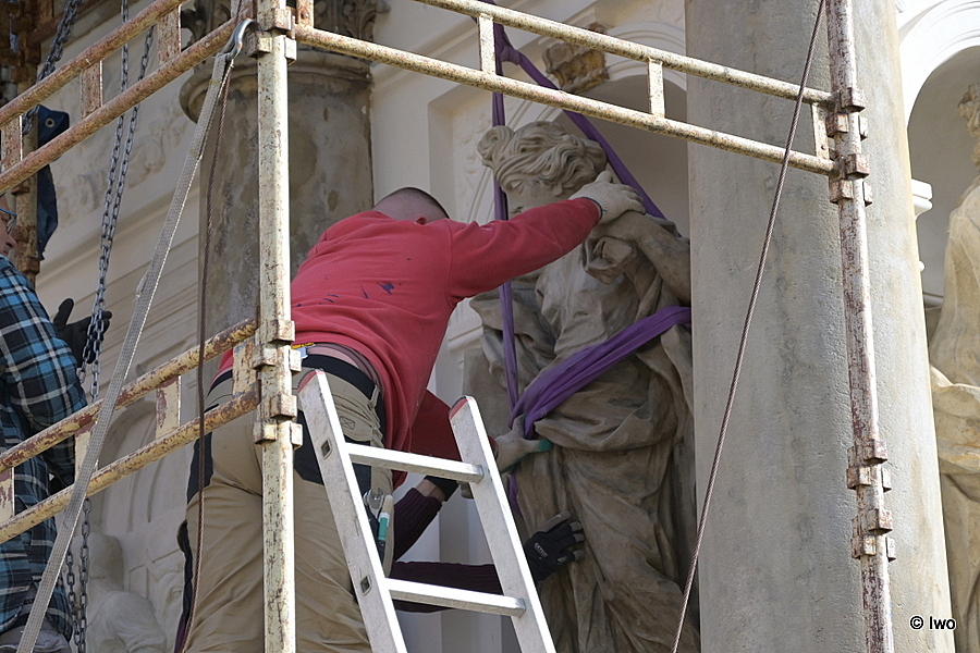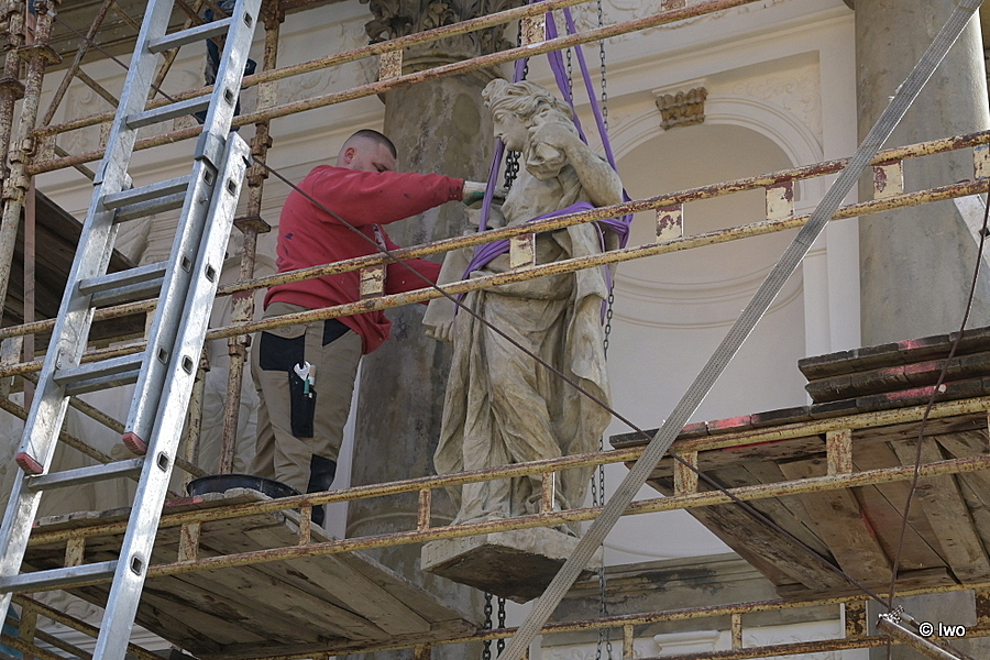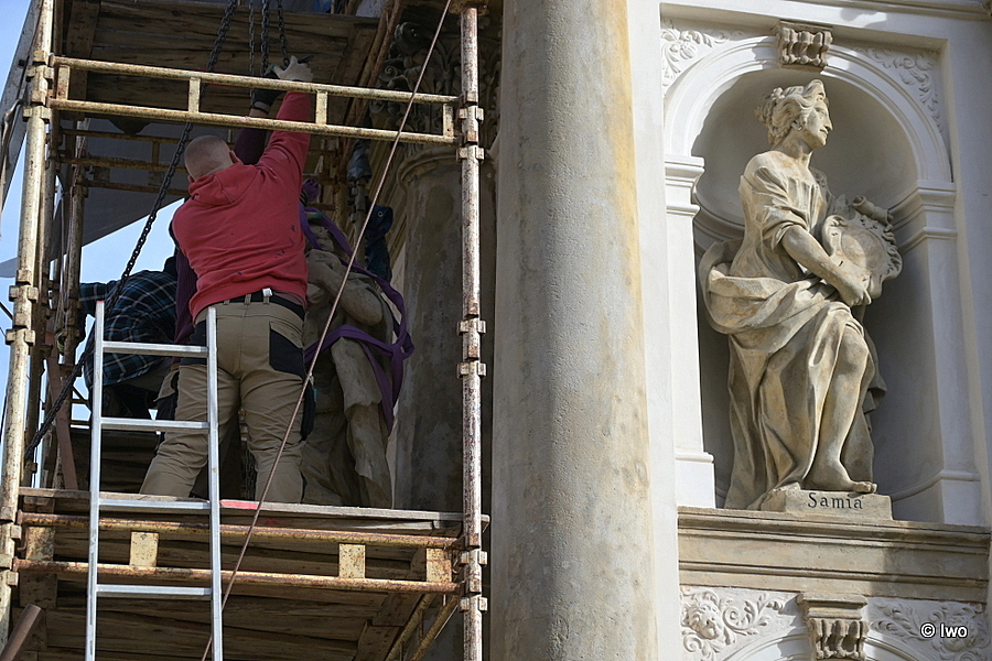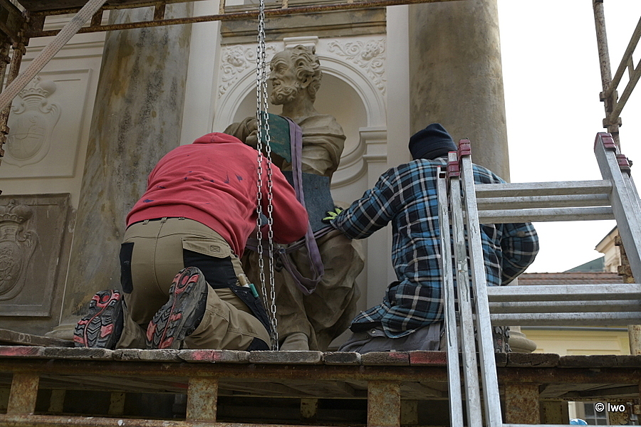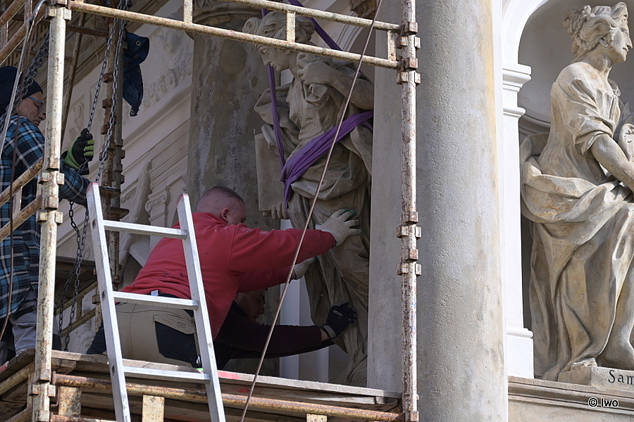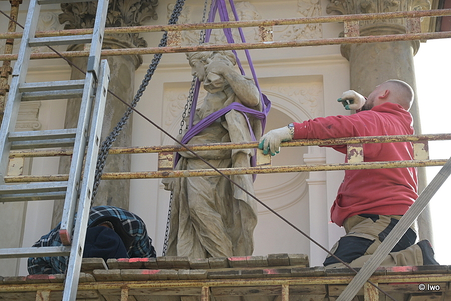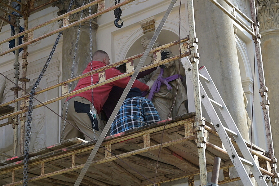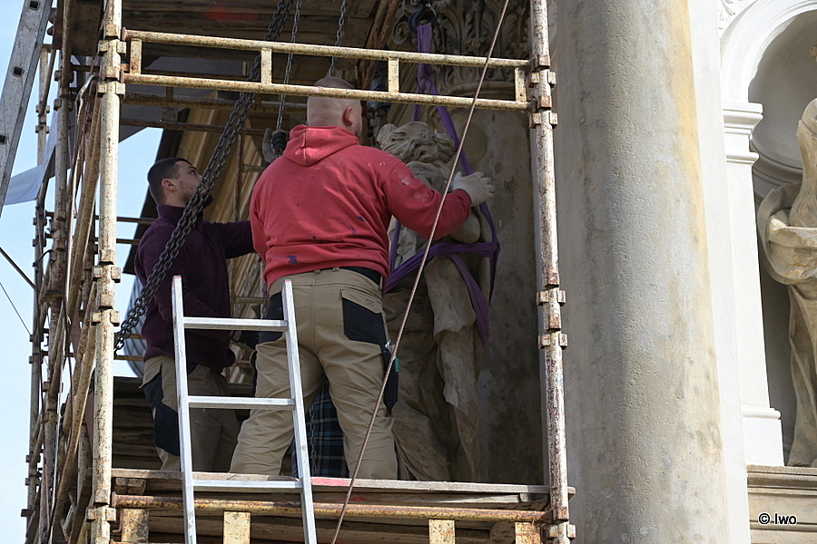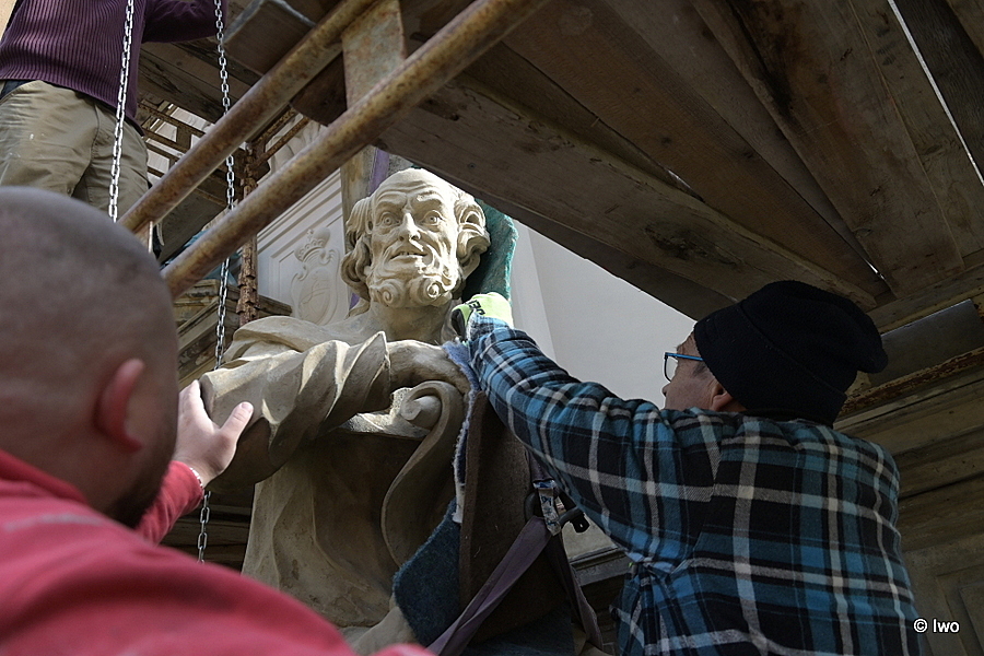 Pokud je člověk schopen vstřebat opravu štuků (ba ji nějaký čas mít možnost sledovat na vlastní oči), u soch představivost trochu selhává. Když ty kamenné kolosy vidíte stát dole na trávě, nechce se věřit, že „vyletěly“ z prázdných výklenků a zase se do nich vrátí. Jenže se tak stalo.