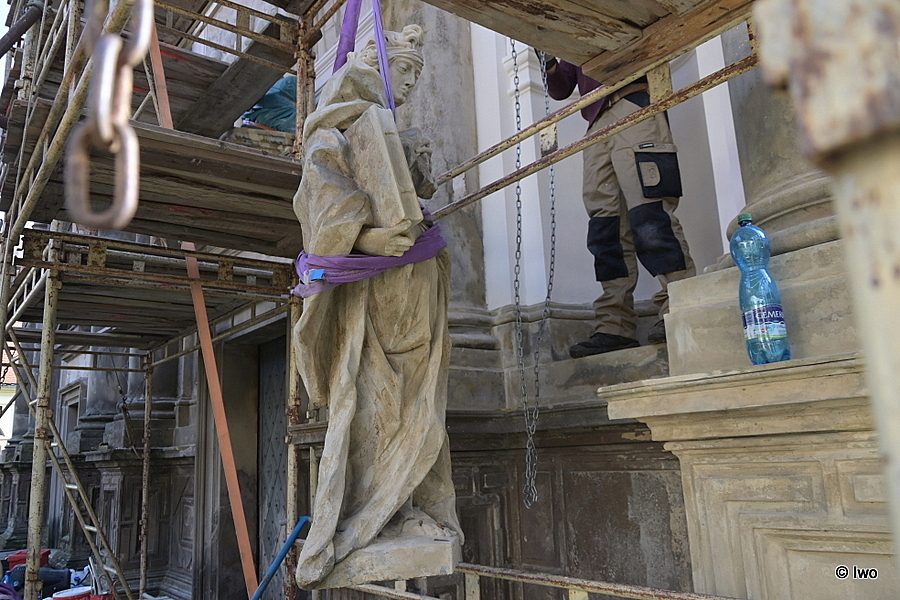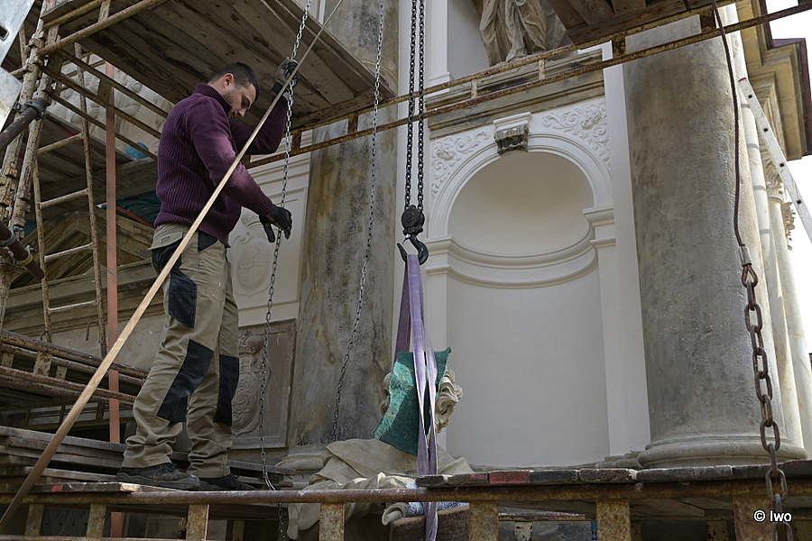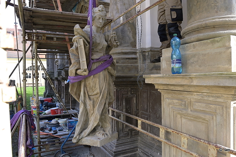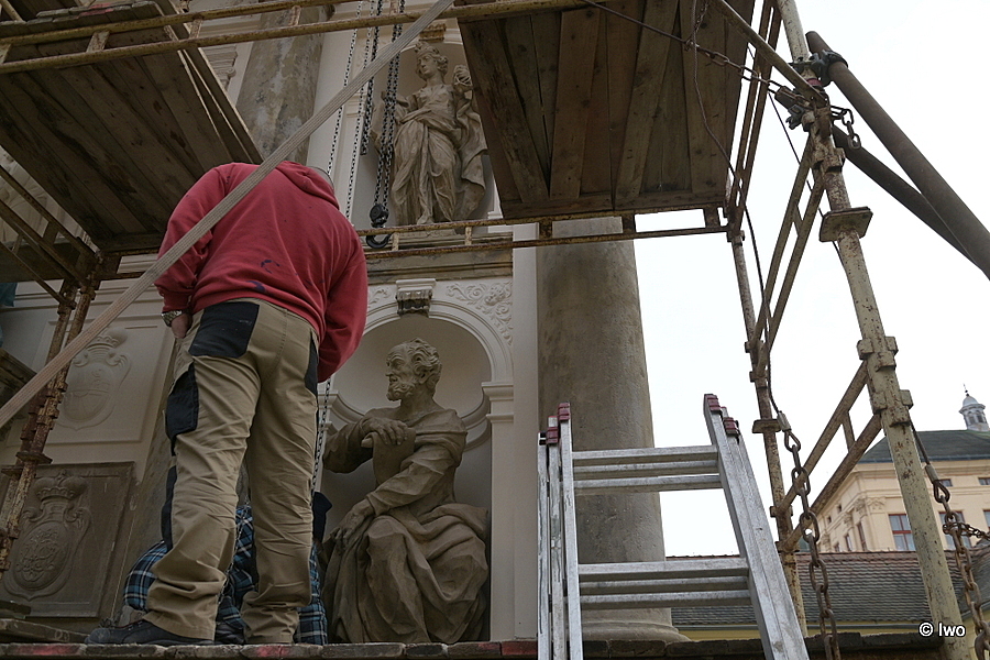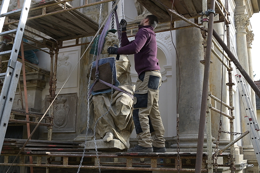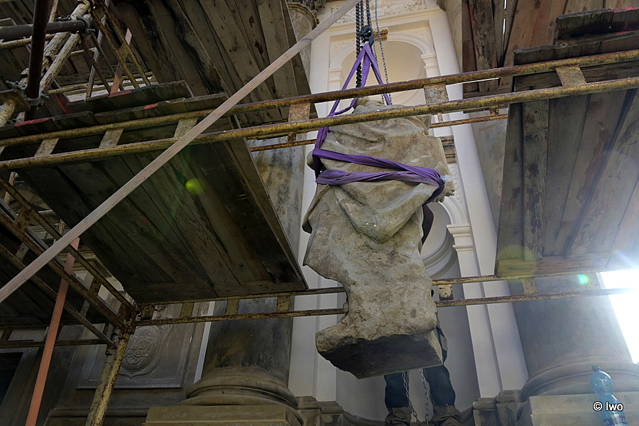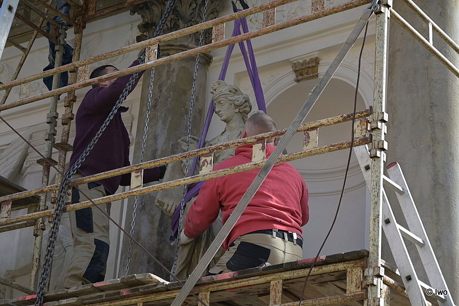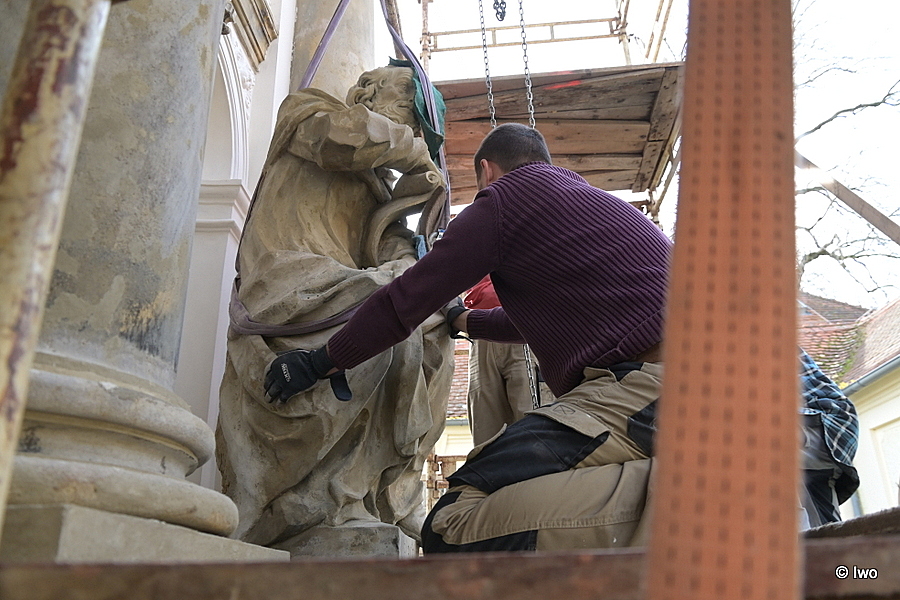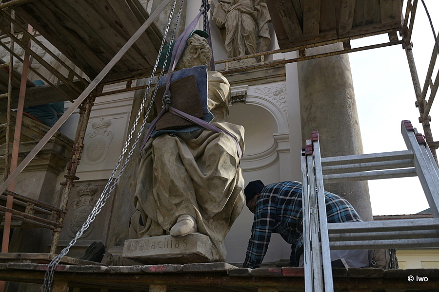 Pokud je člověk schopen vstřebat opravu štuků (ba ji nějaký čas mít možnost sledovat na vlastní oči), u soch představivost trochu selhává. Když ty kamenné kolosy vidíte stát dole na trávě, nechce se věřit, že „vyletěly“ z prázdných výklenků a zase se do nich vrátí. Jenže se tak stalo.