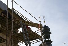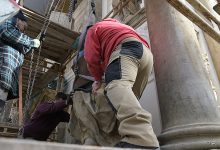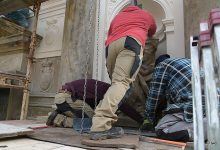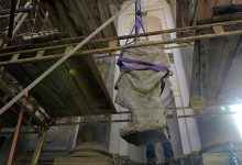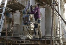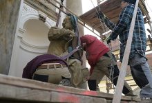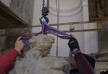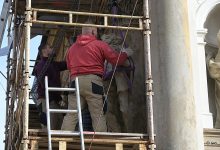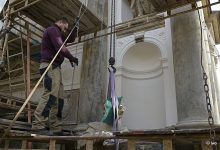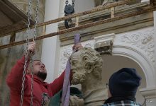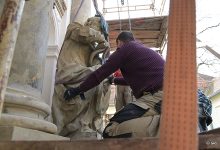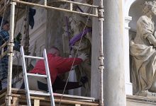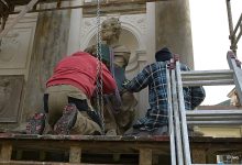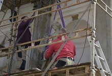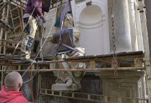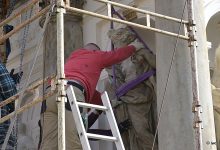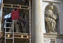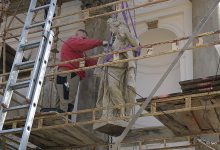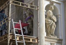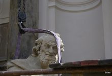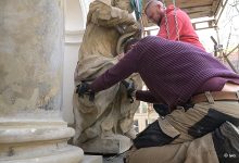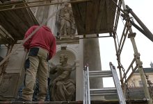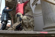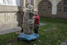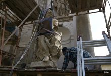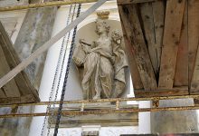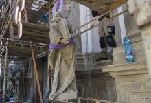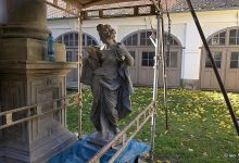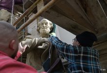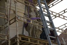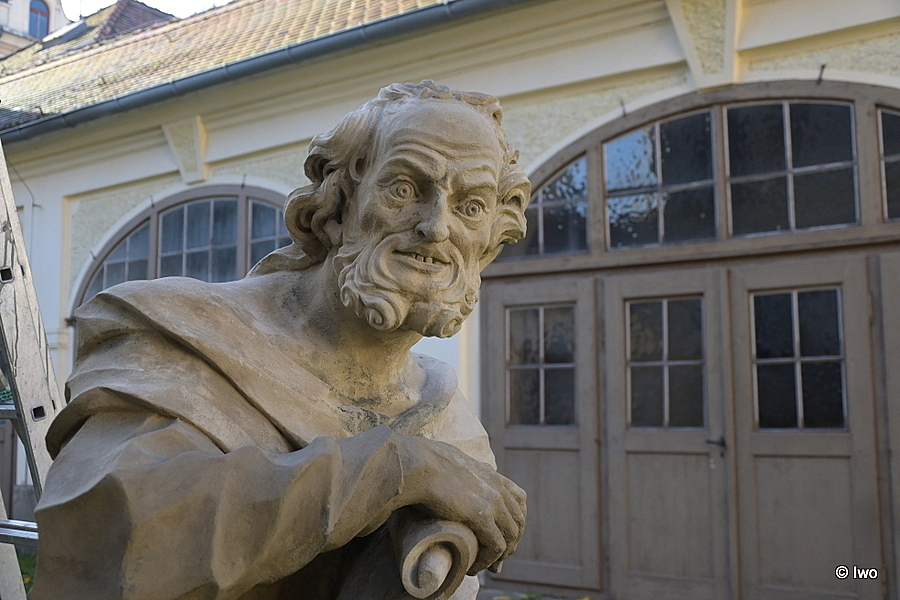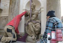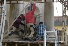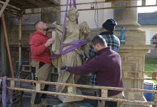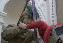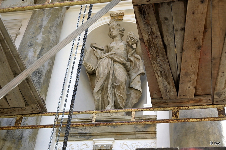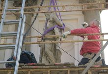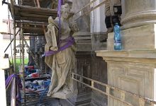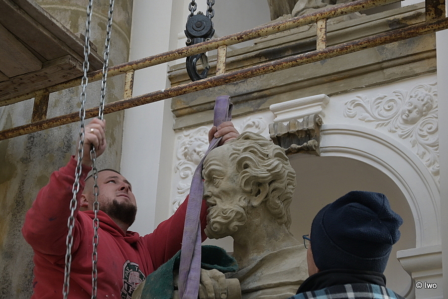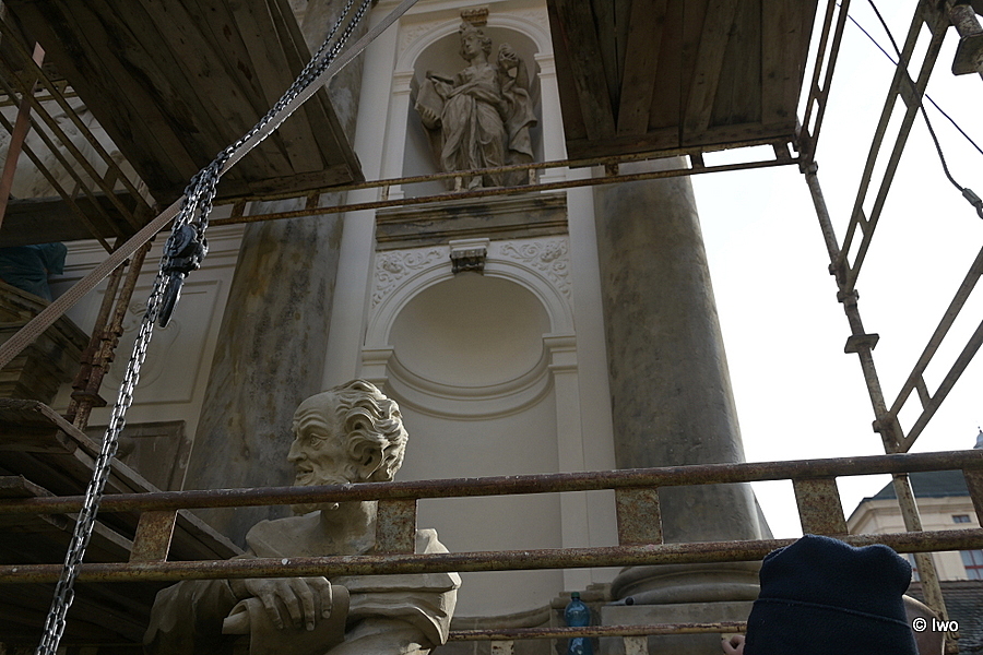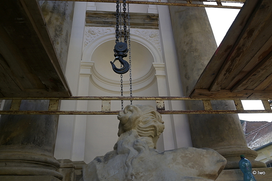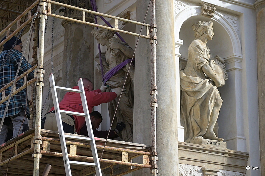 Pokud je člověk schopen vstřebat opravu štuků (ba ji nějaký čas mít možnost sledovat na vlastní oči), u soch představivost trochu selhává. Když ty kamenné kolosy vidíte stát dole na trávě, nechce se věřit, že „vyletěly“ z prázdných výklenků a zase se do nich vrátí. Jenže se tak stalo.