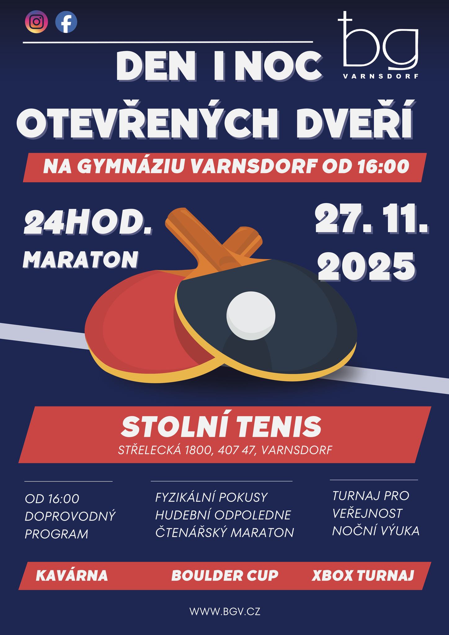 Od čtvrtka 27. do pátku 28. listopadu 2025 se koná na varnsdorfském gymnáziu tradičně netradiční Den otevřených dveří, spojený s 24hodinovým maratonem ve stolním tenise.