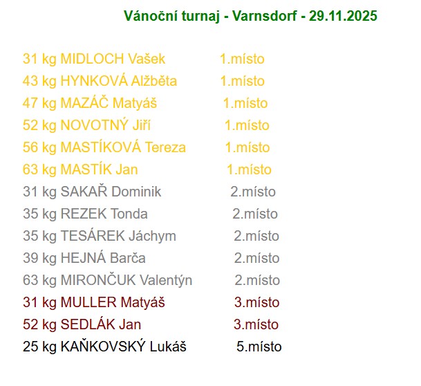 Chrastavští zápasníci se dnes 29. 11. 2025 zúčastnili tradičního vánočního turnaje ve Varnsdorfu, kde se sjelo na 97 závodníků ze 16 oddílů. Někomu se dařilo více, někomu méně, někdo si zkusil žíněnku úplně poprvé a ty bych chtěla moc pochválit za bojovnost. Zápas není lehký sport jak psychicky tak fyzicky a je potřeba to skloubit aby to sedlo a na to je potřeba se stále učit a spolupracovat. Děkujeme rodičům za podporu a důvěru a našim rozhodčím Karlu Hazimu a Tadeasovi Haklovi .