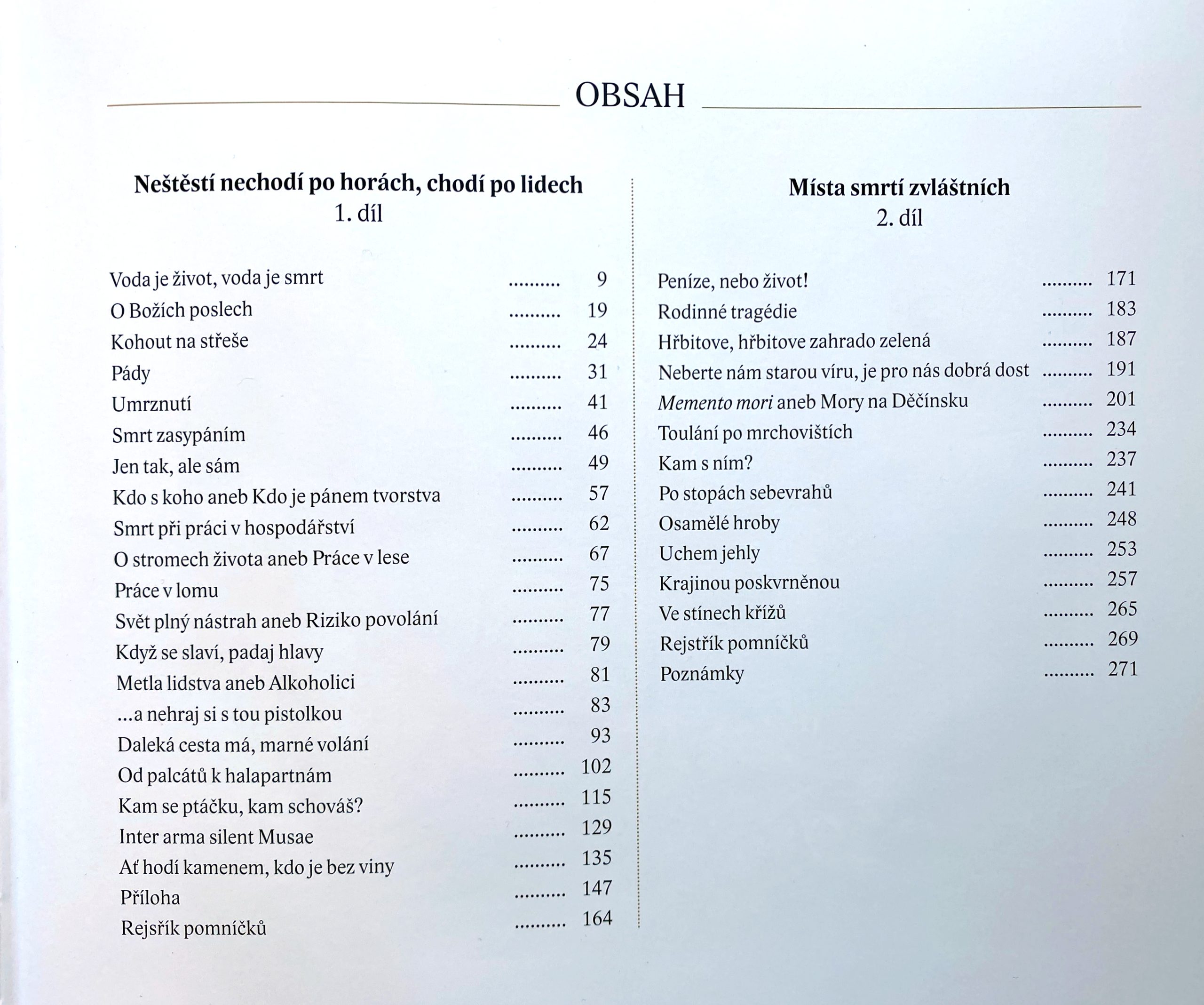 Kniha navazuje na již v roce 2017 vydaný titul … a v prach se obrátíš aneb Bídáci z Děčínska. Pravda, museli jsme si počkat – jak autorka sdělila, čekalo se na někoho, kdo by se napsaného textu a knihy ujal. Učinilo tak nakonec Oblastní muzeum v Děčíně ve spolupráci se Společností přátel Děčína Amici Decini za finanční podpory místního patriota a donátora Valdemara Grešíka. A zmíněná návaznost? V Bídácích se umíralo především násilně (ať již rukou vrahů nebo následných soudů). I tentokrát jde o smrt, sice neobvyklou, ale „přírodní“ – ne vždy život končí vysokým věkem. Voda, blesky, oheň, pády, mráz, závaly, práce všeho druhu, alkohol, vojny a války – je toho přehršel. Po lidských osudech pak druhá část, věnovaná „poskvrněným místům, patogenním zónám, výronům energie a bloudícím přízrakům“.