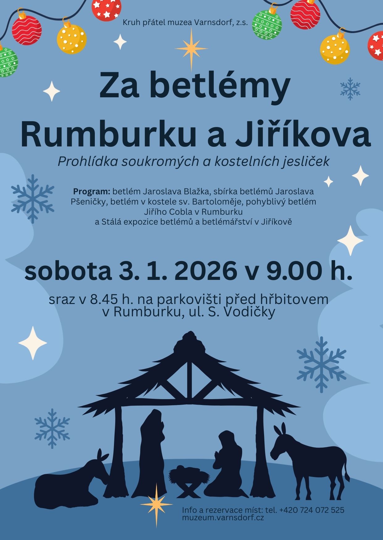 Za betlémy se bude putovat spolu s průvodcem v sobotu 3. ledna 2026 od 9.00 hod. Zájemci se seznámí s betlémem Jaroslava Blažka, následuje prohlídka jesliček ze sbírky Jaroslava Pšeničky, kostelního betlému v děkanském kostele sv. Bartoloměje v Rumburku, pohyblivého betlému Jiřího Cobla v Rumburku – Dolních Křečanech a návštěva Stálé expozice betlémů a betlémářství v Jiříkově. Sraz je v 8.45 hod. na parkovišti u hřbitova v Rumburku (ul. S. Vodičky). Vzhledem ke vzdálenostem mezi jednotlivými místy se účastníci budou přemisťovat osobními automobily. Putování za betlémy pořádá spolek Kruh přátel muzea Varnsdorf. Info a rezervace míst na tel. +420 724 072 525. Akce je zdarma.
