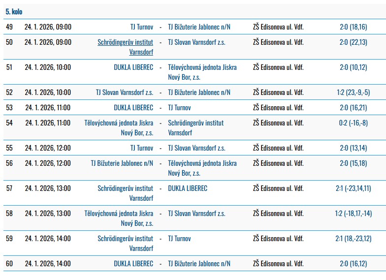 V sobotu 24. ledna 2026 pokračovalo volejbalové klání krajského přeboru mladších žákyň U14 (šestek) 5. kolem, tentokrát v tělocvičně Základní školy Edisonova Varnsdorf.