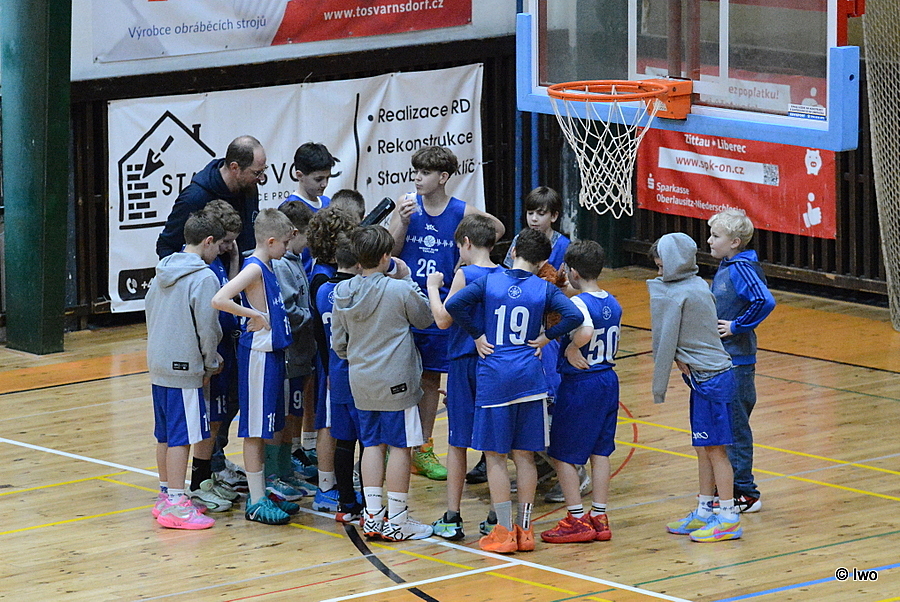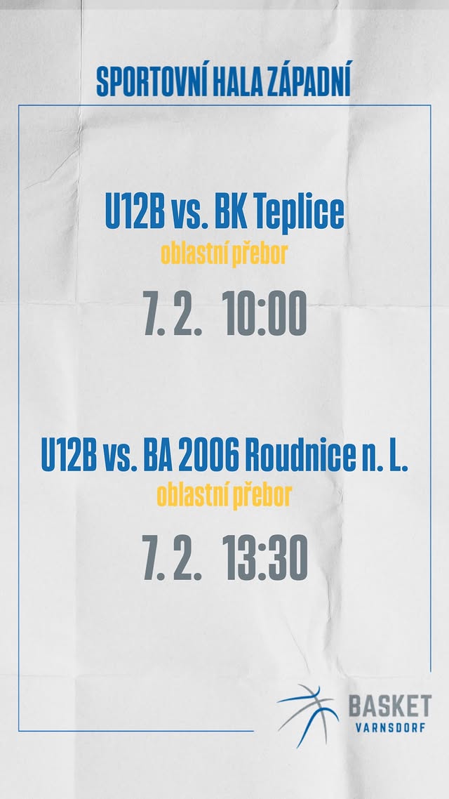 Po zrušeném pátečním utkání začalo basketbalové dění ve sportovní hale ve Varnsdorfu až v sobotu 7. února 2026. Dopoledne se tu konalo 9. kolo oblastního přeboru mladších minižáků U12, jako první prosti sobě nastoupila družstva TJ Slovan Varnsdorf a BK Teplice.