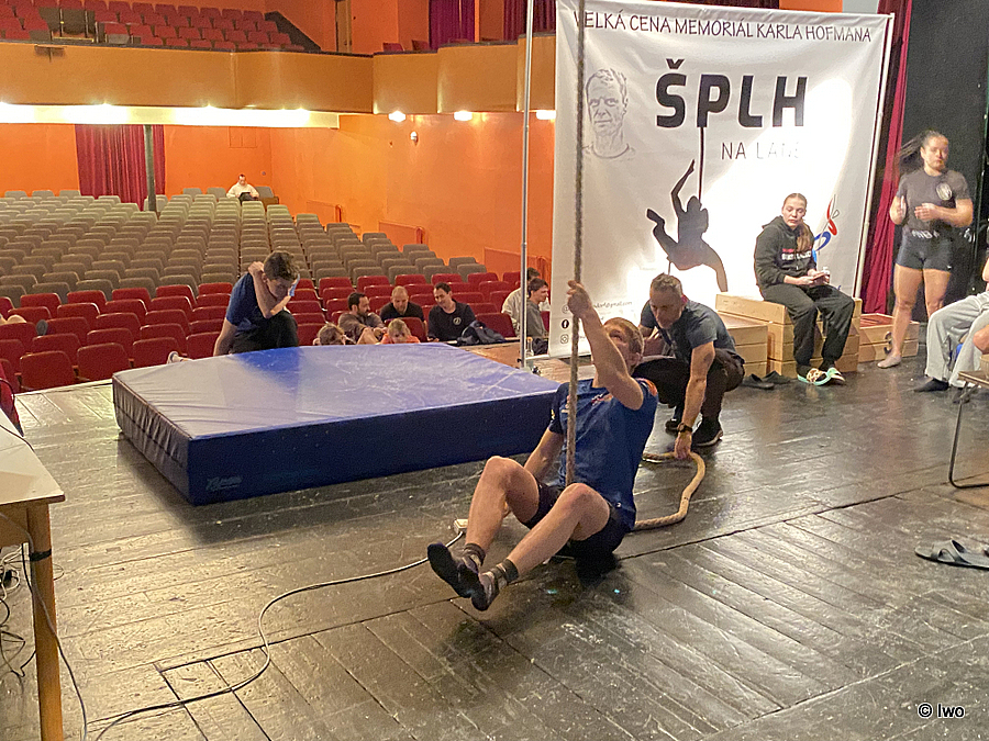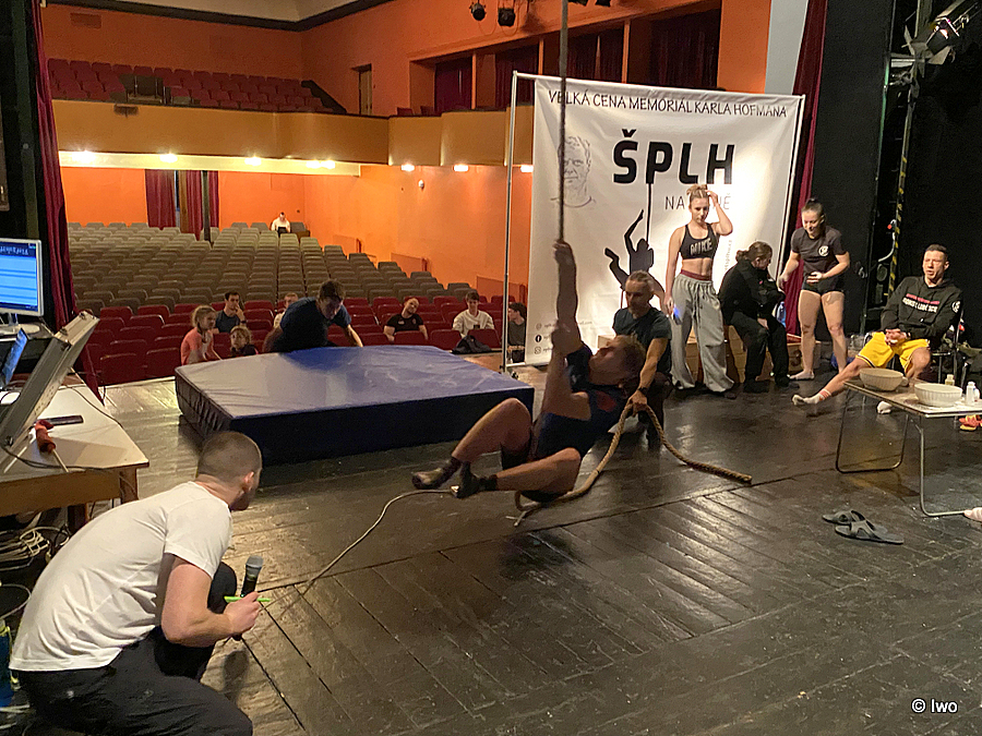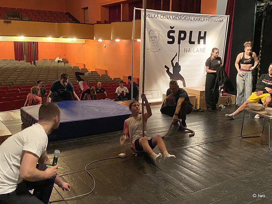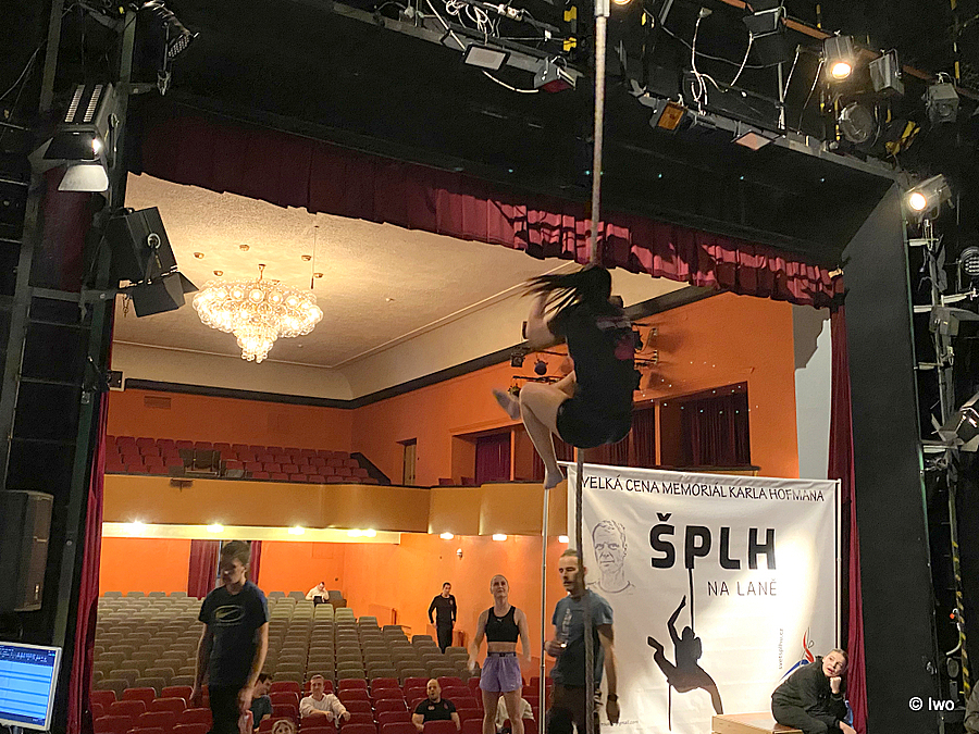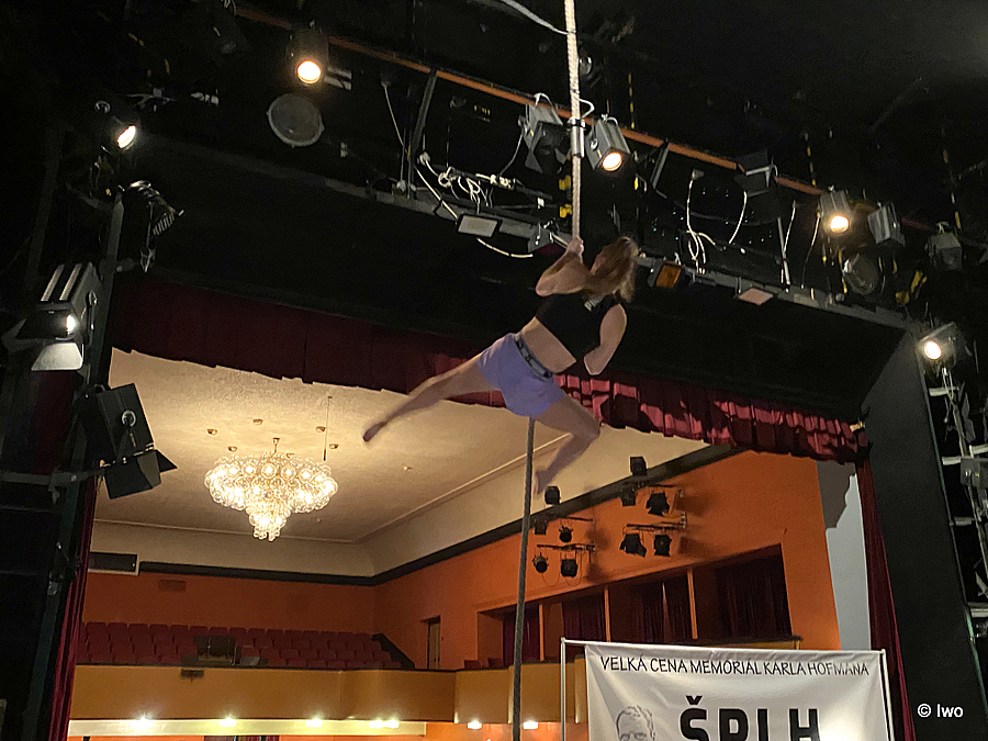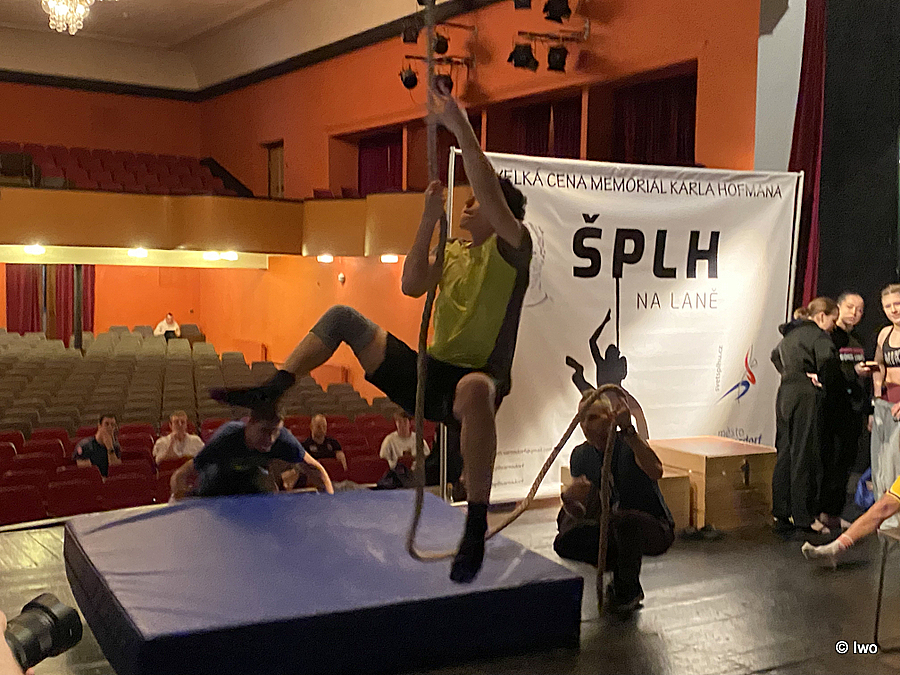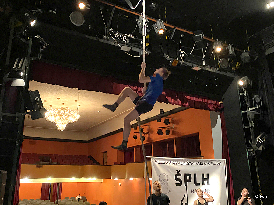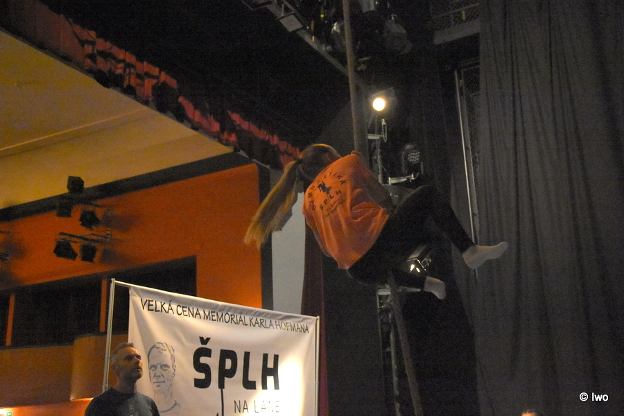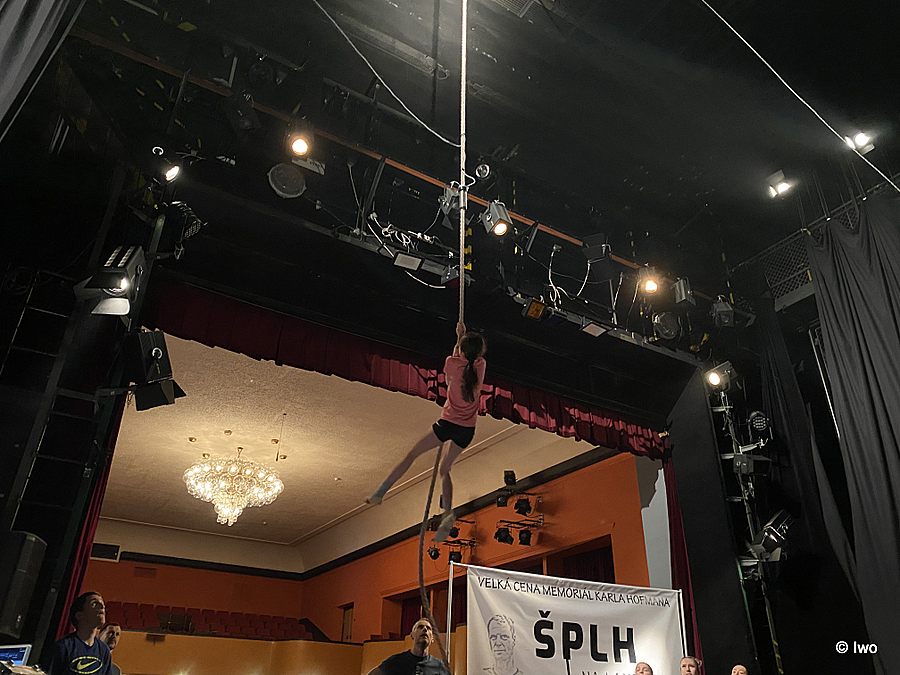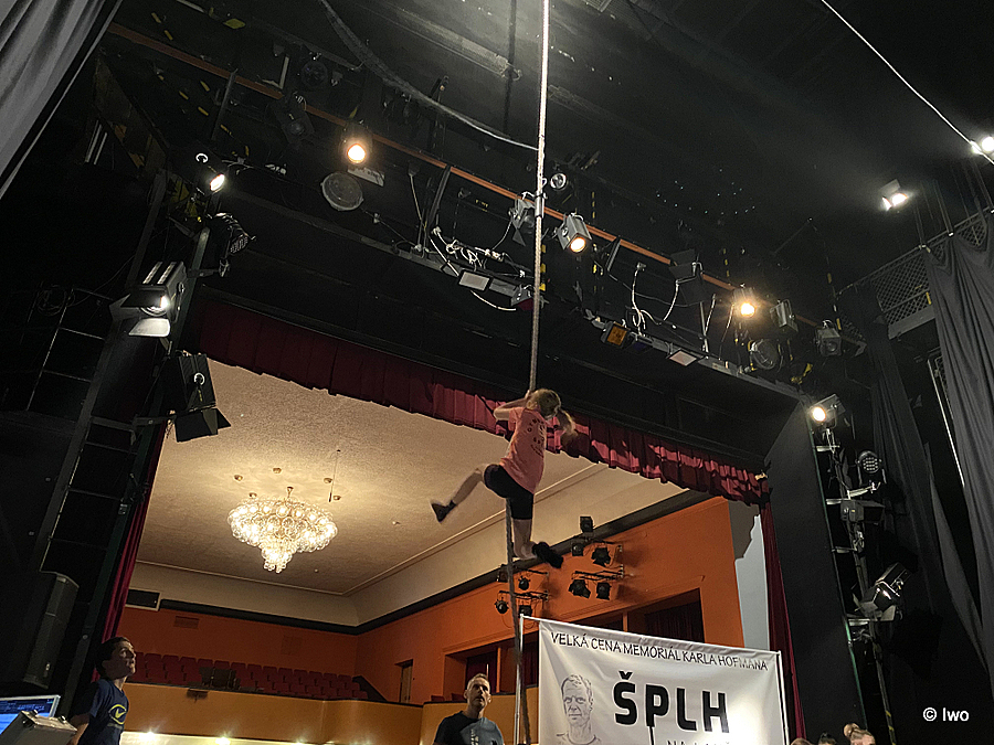 O téhle akci vím, koná se pravidelně. Nicméně v poněkud pro mne odtažité sociální bublině a jako job někoho úplně jiného. Kdysi dávno jsem se podívat byl (viz dále). Jeden rok jsem ve sportovní hale, kde tato akce vždy probíhala, narazil na pozamykané dveře (a od té doby to nezkusil). Jenže letos byla sportovní hala zadána a šplh se přestěhoval do zcela netradičních míst – do Městského divadla. Což byl důvod, abych se alespoň na pár minut stavil, jak to v takovém prostoru vypadá. Organizace precizní, profi provedení. Leč domácí tu (alespoň co jsem já zahlédl) reprezentovalo pár organizátorů (ani soutěžící, ani diváci). Výsledky ještě k dispozici nejsou, ale co jsem viděl startovací listinu „nižší“ kategorie na 4,5 metru, pak všehovšudy Dvůr Králové, Libčice a Praha. Jestli na 8 metrech byl i někdo odjinud, to už nevím.