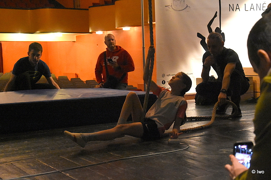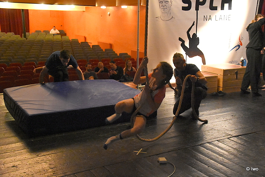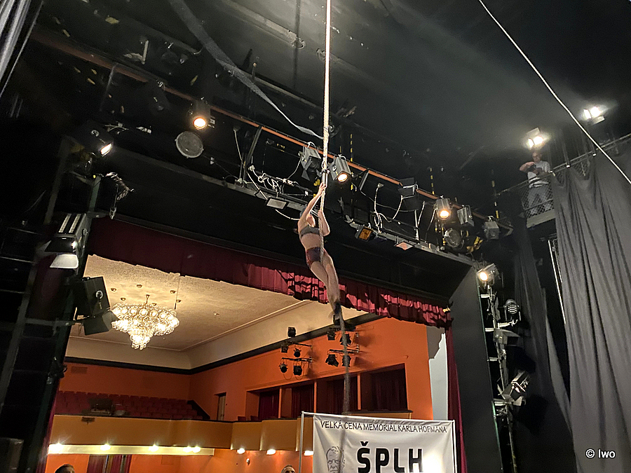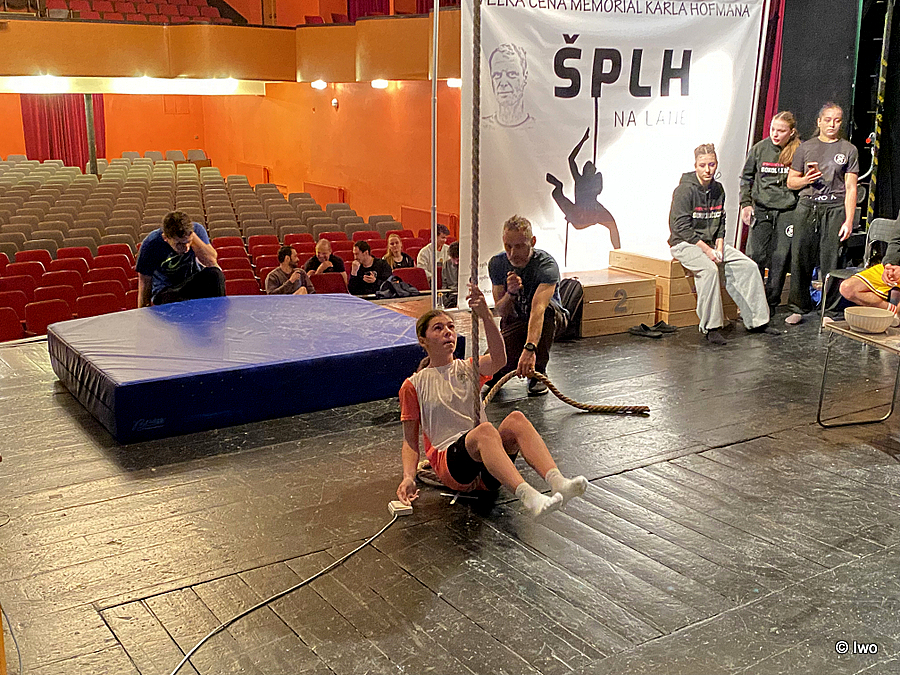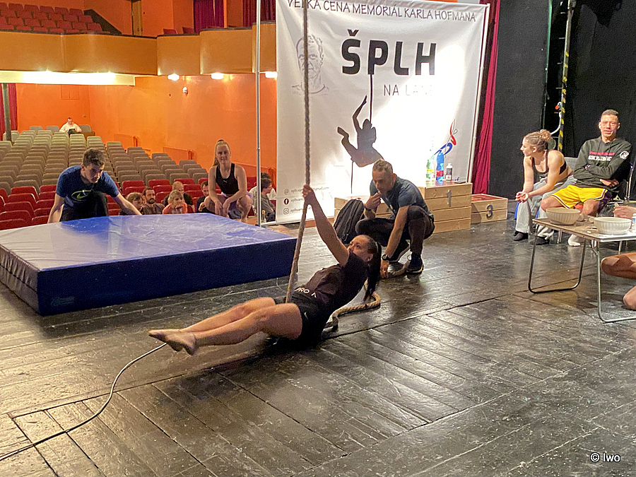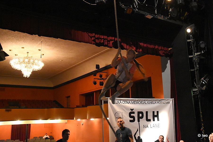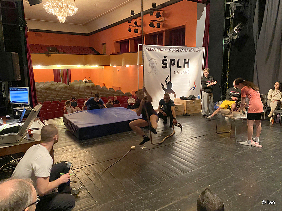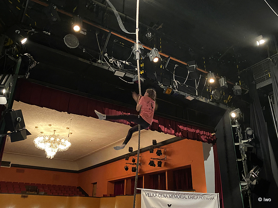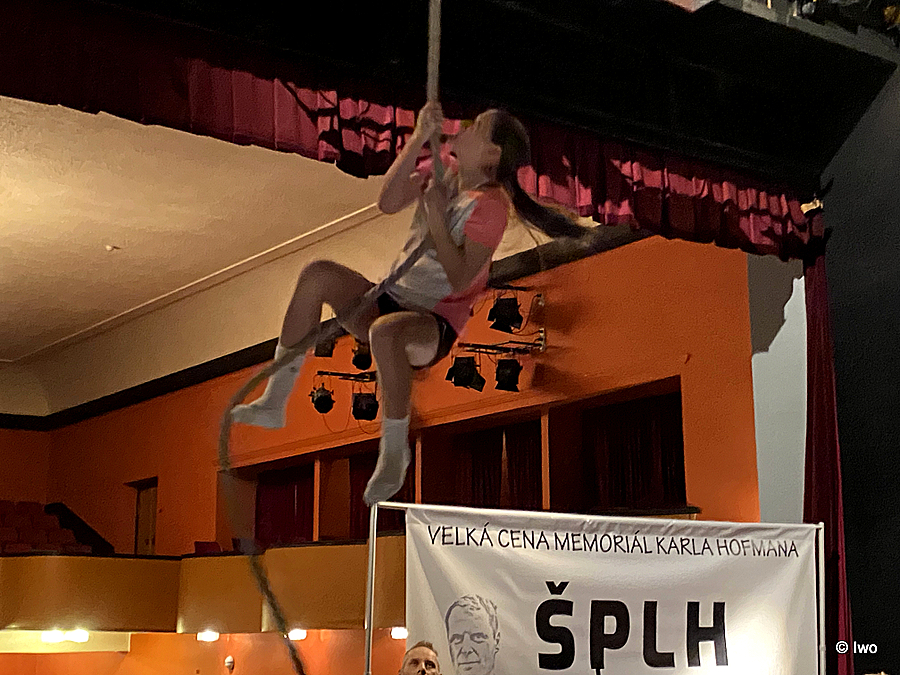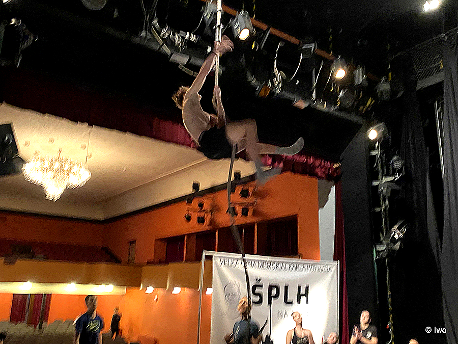 O téhle akci vím, koná se pravidelně. Nicméně v poněkud pro mne odtažité sociální bublině a jako job někoho úplně jiného. Kdysi dávno jsem se podívat byl (viz dále). Jeden rok jsem ve sportovní hale, kde tato akce vždy probíhala, narazil na pozamykané dveře (a od té doby to nezkusil). Jenže letos byla sportovní hala zadána a šplh se přestěhoval do zcela netradičních míst – do Městského divadla. Což byl důvod, abych se alespoň na pár minut stavil, jak to v takovém prostoru vypadá. Organizace precizní, profi provedení. Leč domácí tu (alespoň co jsem já zahlédl) reprezentovalo pár organizátorů (ani soutěžící, ani diváci). Výsledky ještě k dispozici nejsou, ale co jsem viděl startovací listinu „nižší“ kategorie na 4,5 metru, pak všehovšudy Dvůr Králové, Libčice a Praha. Jestli na 8 metrech byl i někdo odjinud, to už nevím.